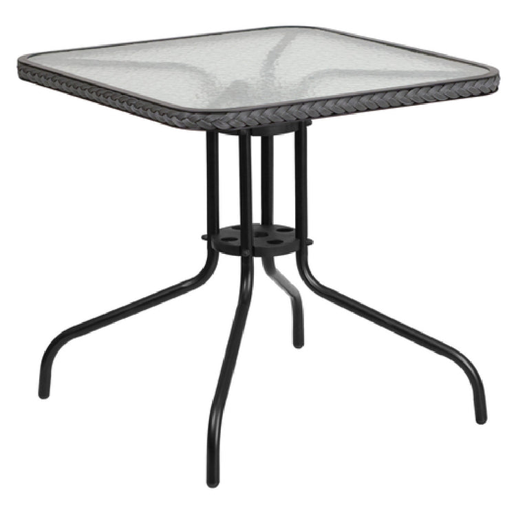 Flash Furniture TLH-073R-GY-GG Patio Table is a versatile and functional piece designed for both indoor and outdoor use. Measuring 28 inches in width, depth, and height, this square table offers a compact yet stylish solution for various settings. The table features a 5mm tempered glass top, providing a sleek and durable surface that can withstand the elements. Its 1-3/8 inch dark gray rattan edge adds an elegant touch, seamlessly blending with different décor styles. The metal base, equipped with a powder coat finish, ensures long-lasting durability and resistance to weather conditions. Additionally, protective plastic floor glides are included, safeguarding your floors and enhancing stability. This patio table requires assembly and is readily available, with in-stock items typically shipping within 24 hours. The Flash Furniture TLH-073R-GY-GG Patio Table is an excellent choice for those seeking a reliable and aesthetically pleasing table, suitable for residential patios, commercial outdoor spaces, and indoor environments that demand durability and style. Its thoughtful design caters to diverse markets, from homeowners to hospitality businesses, offering a practical yet visually appealing furniture option.