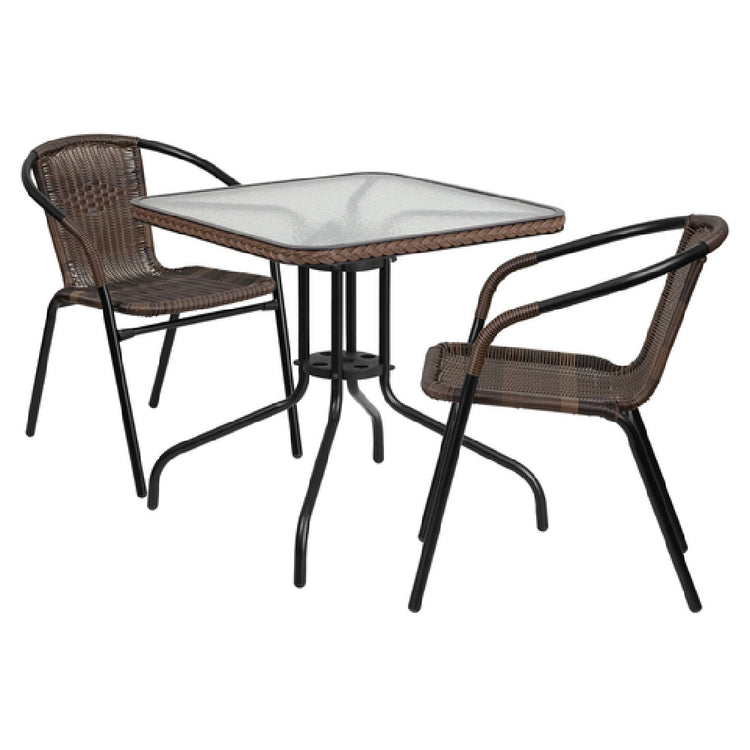 Flash Furniture TLH-073SQ-037BN2-GG Table & Chair Set is a versatile and practical addition to any indoor or outdoor space. This set includes a 28"W x 28"D x 28"H square table, featuring a sturdy 5mm thick glass top and a 1-3/8" thick edge, accentuated with a decorative dark brown rattan band. The table rests on a black powder-coated metal base, ensuring durability and stability, while protective plastic floor glides prevent floor damage. Accompanying the table are two stacking cafe armchairs, designed with a curved back for ergonomic support. The chairs feature a dark brown rattan back and seat, complemented by a black powder-coated metal frame, resulting in a lightweight yet robust construction. This set is ideal for both residential and commercial settings, accommodating the needs of cafes, patios, or dining areas. Shipped in two boxes, the Flash Furniture TLH-073SQ-037BN2-GG Table & Chair Set requires assembly, and in-stock items typically ship within 24 hours, making it a convenient choice for those seeking quality and prompt delivery. Its blend of style, functionality, and adaptability makes it an attractive option for a wide range of market segments.