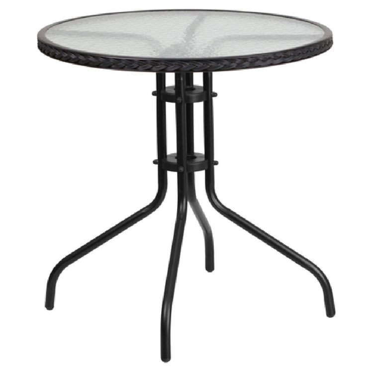 Flash Furniture TLH-087-BK-GG Patio Table 28" Dia. X 28"H Round is a versatile piece designed to enhance both indoor and outdoor spaces. This elegant round table features a 28-inch diameter and stands 28 inches high, providing a compact yet functional surface suitable for various settings. The table's top is crafted from 5mm tempered glass, offering a sleek and durable surface that's easy to clean and maintain. Encircling the glass is a 1-1/4" black rattan edge, adding a touch of sophistication and style. The sturdy black powder-coated metal base ensures stability and longevity, making it a reliable choice for any environment. Protective plastic floor glides are included to safeguard your flooring surfaces from scratches and scuffs. Designed with versatility in mind, this table is ideal for both residential and commercial use, accommodating a range of activities from casual dining to professional settings. While assembly is required, the table ships quickly, with in-stock items typically dispatched within 24 hours, ensuring prompt delivery for your convenience. The Flash Furniture TLH-087-BK-GG Patio Table is a practical and stylish solution for those seeking a durable and attractive addition to their indoor or outdoor decor.