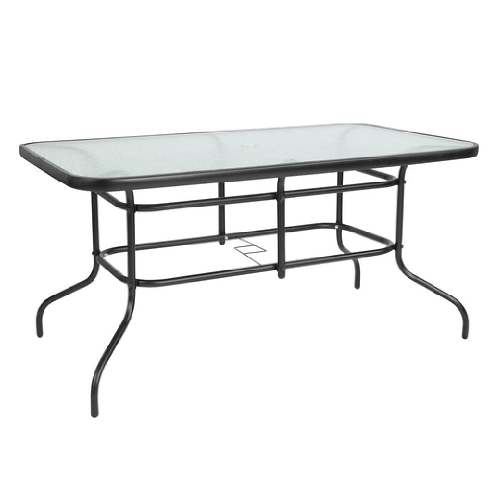 The Flash Furniture TLH-089-GG Patio Table is a versatile piece designed to meet the needs of various market segments within the furniture industry. At 55 inches wide, 31-1/2 inches deep, and 27-1/2 inches high, this rectangular table is perfectly sized for both intimate and larger gatherings. Its clear tempered glass top, with a thickness of 5mm and a 1-1/2 inch edge, offers a sleek and modern aesthetic, while ensuring durability and safety. The table features a 2-1/2 inch diameter umbrella hole, providing functionality for outdoor settings by accommodating standard umbrella poles. Designed for both indoor and outdoor use, the table is equipped with plastic floor glides to protect surfaces and ensure stability. The metal frame is finished with a black powder coat, enhancing its resilience against weather elements and adding a touch of elegance. This combination of design and practical features makes the Flash Furniture TLH-089-GG Patio Table an appealing option for homeowners looking to enhance their patio spaces, as well as businesses in the hospitality sector seeking durable and stylish furniture solutions. Its robust construction and functional design cater to a diverse range of environments, from residential patios to commercial outdoor dining areas.
