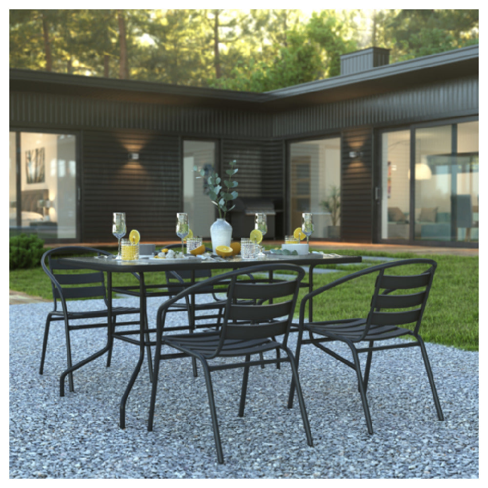 The Flash Furniture TLH-089REC-017CBK4-GG Lila 5 Piece Patio Dining Set is a stylish and functional addition to any outdoor space, featuring a 55-inch tempered glass patio table complete with an umbrella hole for added convenience and versatility. This set includes four black metal aluminum slat stack chairs designed for durability and ease of storage. The tempered glass table top not only provides a sleek, modern aesthetic but also offers long-lasting strength and resistance to the elements. The inclusion of an umbrella hole caters to those looking to add shade or protection from the sun, enhancing comfort during dining. The black metal aluminum slat stack chairs are lightweight yet robust, offering a perfect balance of portability and strength, making them ideal for both residential and commercial settings. This patio dining set is designed to cater to a variety of market segments, from homeowners seeking a stylish and durable outdoor dining solution to businesses in the hospitality industry looking for reliable and space-efficient furniture options. The Flash Furniture TLH-089REC-017CBK4-GG Lila set stands out for its blend of aesthetic appeal, functional design, and practical features, making it a versatile choice for diverse outdoor environments.