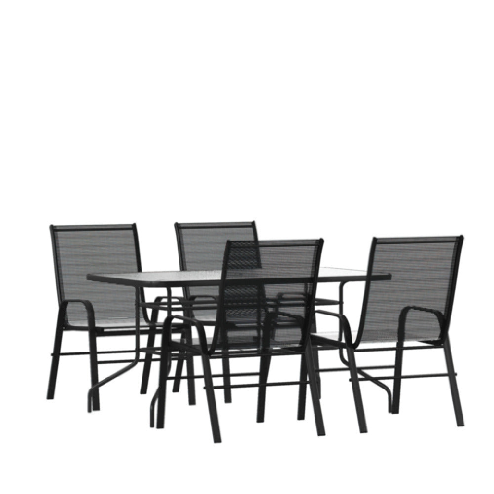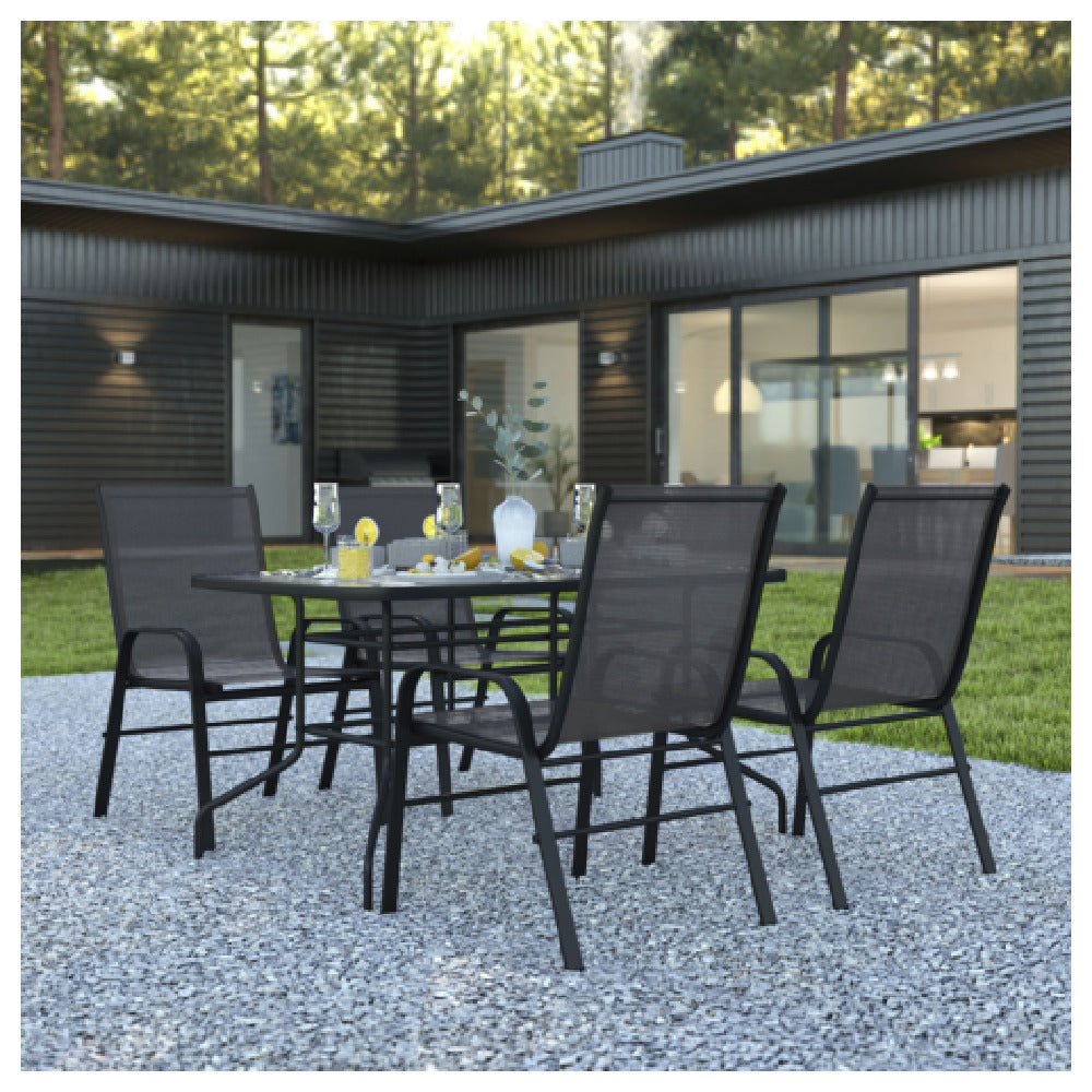 The Flash Furniture TLH-089REC-303CBK4-GG Brazos 5 Piece Outdoor Patio Dining Set is a comprehensive outdoor seating solution designed for both style and functionality. Featuring a 55-inch tempered glass patio table, this set is ideal for those who value durability and aesthetics in their outdoor spaces. The table is equipped with an umbrella hole, providing the option to add shade on sunny days, enhancing the dining experience. Accompanied by four black Flex Comfort stack chairs, the set ensures comfortable seating with the convenience of easy storage when not in use. The stackable design of the chairs maximizes space efficiency, making this dining set a practical choice for various outdoor settings, from residential patios to commercial hospitality venues. The sleek black finish complements a wide range of outdoor décors, while the tempered glass table top offers a modern touch and easy maintenance. This dining set is particularly suitable for environments where durability and ease of use are essential, providing a versatile and reliable option for outdoor enjoyment. Whether for family gatherings or entertaining guests, the Brazos 5 Piece Outdoor Patio Dining Set delivers both comfort and style, making it a valuable addition to any outdoor space.