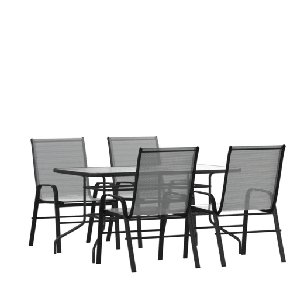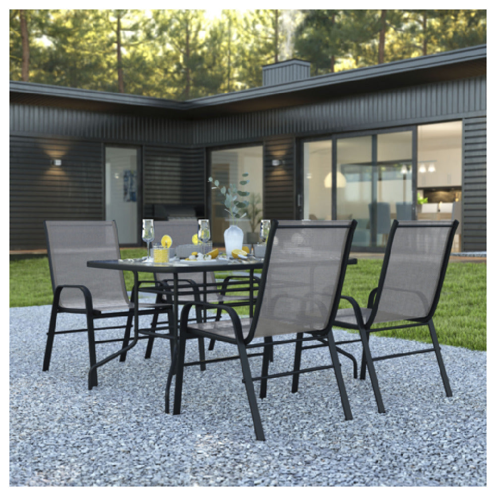 The Flash Furniture TLH-089REC-303CGY4-GG Brazos 5 Piece Outdoor Patio Dining Set is a versatile ensemble designed to enhance outdoor dining experiences across various settings. This set features a 55-inch tempered glass patio table, offering both durability and elegance, complete with an umbrella hole for added functionality during sunny days. Accompanying the table are four Gray Flex Comfort Stack Chairs, which provide both style and comfort, engineered to stack easily for convenient storage. The sleek design of the tempered glass table not only ensures longevity but also adds a modern touch to any patio or garden. Suitable for both residential and commercial applications, this dining set caters to different market segments by providing an ideal solution for home patios, restaurant outdoor seating, or any business looking to enhance their outdoor spaces. The combination of robust materials and thoughtful design ensures a reliable and practical addition to any outdoor setting, making the Flash Furniture Brazos Dining Set a smart choice for those seeking quality and style in outdoor furniture solutions.