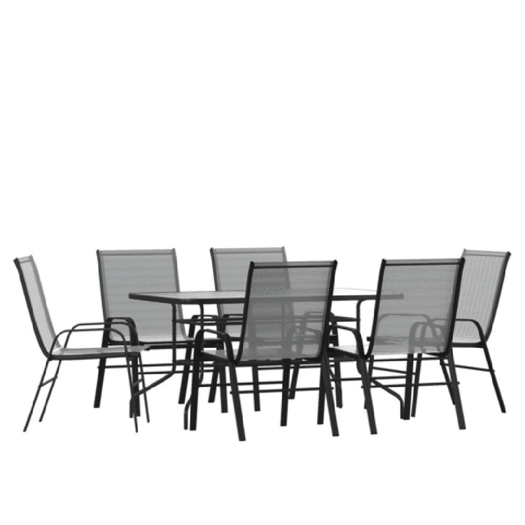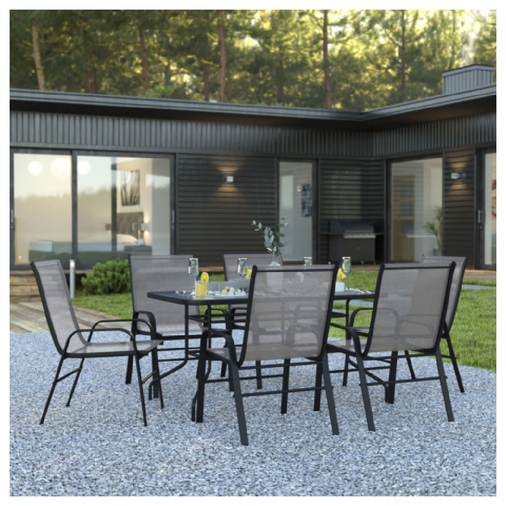 The Flash Furniture TLH-089REC-303CGY6-GG Brazos 7 Piece Outdoor Patio Dining Set is an exceptional combination of style and functionality, designed to enhance outdoor dining experiences. This set includes a 55-inch tempered glass patio table, which is not only durable but also features an umbrella hole for added convenience, catering to diverse weather conditions. Accompanying the table are six gray Flex Comfort stack chairs, providing both comfort and practicality with their stackable design, making them ideal for easy storage and space management. The elegant gray color scheme aligns with contemporary outdoor aesthetics, appealing to a wide range of consumer preferences. Perfect for residential backyards, hospitality venues, or commercial spaces, this dining set offers versatility and robustness. The tempered glass table top ensures safety and durability, while the umbrella hole facilitates the addition of shade or decorative elements. Whether for casual family gatherings, formal outdoor functions, or dining in commercial settings, the Flash Furniture Brazos set seamlessly integrates into various environments, providing a comprehensive solution that prioritizes comfort, convenience, and style. This product's unique value lies in its blend of modern design and practical features, making it a desirable choice for diverse market segments seeking reliable and stylish outdoor furniture solutions.