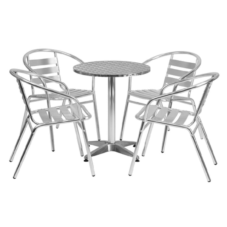 The Flash Furniture TLH-ALUM-24RD-017BCHR4-GG Table & Chair Set includes a meticulously designed table and chair arrangement, perfect for both commercial and residential settings. The centerpiece of this set is a 23-1/2" diameter round table, standing at a height of 27-1/2", featuring a smooth stainless steel top for durability and style. Its aluminum column and base add to its lightweight construction, making it an ideal choice for versatile indoor and outdoor use. Accompanying this table are four stacking chairs, each measuring 21-3/4"W x 22"D x 29"H. The chairs boast a unique curved triple slat aluminum ladder back for enhanced comfort and support, along with a textured aluminum seat. Integrated arms and cross braces further emphasize the chairs' robust design. Additionally, the aluminum frame ensures longevity, while plastic floor glides protect flooring surfaces. This set is lightweight and conveniently shipped in two boxes, with in-stock items typically dispatched within 24 hours. Designed for those seeking a blend of functionality and contemporary style, this set requires minimal assembly, making it an attractive option for cafes, patios, or dining areas looking to enhance their aesthetic appeal with practical furnishings.
