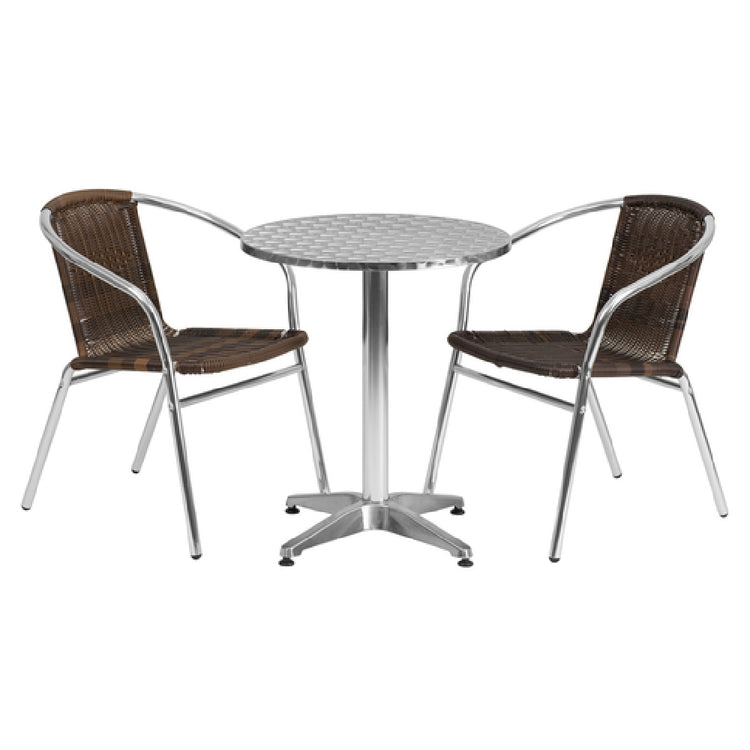 The Flash Furniture TLH-ALUM-24RD-020CHR2-GG Table & Chair Set is a versatile furnishing solution, designed for both indoor and outdoor use in commercial and residential settings. This set includes a 23-1/2" diameter round table with a height of 27-1/2", featuring a smooth stainless steel top that offers durability and a sleek appearance. The table is supported by an aluminum column and base, ensuring stability while maintaining a lightweight profile for easy mobility. Accompanying the table are two stacking chairs, each measuring 21-3/4"W x 22"D x 29"H, providing comfortable seating with their curved backs and integrated arms. The chairs feature a dark brown rattan seat and back, which adds a touch of elegance and comfort. Built with an aluminum frame and cross braces, the chairs are designed for strength and durability, while plastic floor glides protect flooring surfaces. This table and chair set requires assembly and is conveniently shipped in two boxes. With items typically shipping within 24 hours, this set is ready to enhance any space with its modern design and functional appeal, making it an ideal choice for diverse market segments including hospitality venues, cafes, patios, and home dining areas.