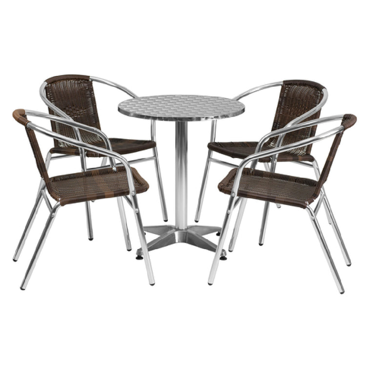 The Flash Furniture TLH-ALUM-24RD-020CHR4-GG Table & Chair Set is an elegant and versatile furniture solution designed for both commercial and residential settings. This set includes a round table featuring a smooth stainless steel top with a diameter of 23-1/2 inches and a height of 27-1/2 inches, supported by a sturdy aluminum column and base. Complementing the table are four stacking chairs with dimensions of 21-3/4 inches in width, 22 inches in depth, and 29 inches in height. Each chair is crafted with a curved back, dark brown rattan seat and back, integrated arms, and cross braces for added support, all structured within a lightweight aluminum frame. The chairs also come with plastic floor glides to safeguard your flooring. This set is designed for both indoor and outdoor use, offering flexibility in various environments. Assembly is required, and the product is conveniently shipped in two boxes. With the combination of durable materials and a sleek design, the Flash Furniture TLH-ALUM-24RD-020CHR4-GG Table & Chair Set is a practical choice for enhancing dining spaces, whether in a bustling café or a tranquil garden setting. Furthermore, it is readily available, with in-stock items typically shipping within 24 hours.