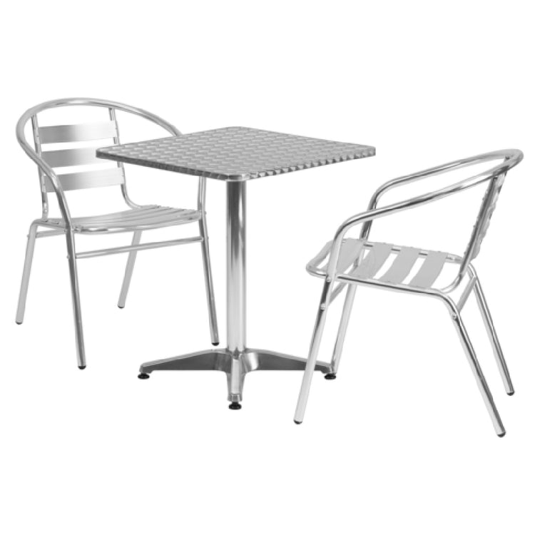 The Flash Furniture TLH-ALUM-24SQ-017BCHR2-GG Table & Chair Set is a versatile and functional furniture set designed for both indoor and outdoor use in commercial and residential settings. This set includes a square table measuring 23-1/2"W x 23-1/2"D x 27-1/2"H, featuring a smooth stainless steel top that provides both durability and a sleek aesthetic. The table is supported by an aluminum column and base, ensuring stability and lightweight maneuverability. Accompanying the table are two stacking chairs, each measuring 21-3/4"W x 22"D x 29"H. The chairs are designed with a curved triple slat ladder back and textured seat for added comfort. Integrated arms and cross braces enhance the structural integrity, while the aluminum frame and plastic floor glides contribute to its lightweight nature and protection of flooring surfaces. This product is shipped in two boxes and typically dispatched within 24 hours, offering a practical solution for those needing quick and efficient furniture arrangements. Assembly is required upon delivery, making it an ideal choice for environments where flexible seating configurations are needed, such as cafes, patios, or meeting spaces. The Flash Furniture TLH-ALUM-24SQ-017BCHR2-GG set combines style and functionality, catering to a wide range of market segments.