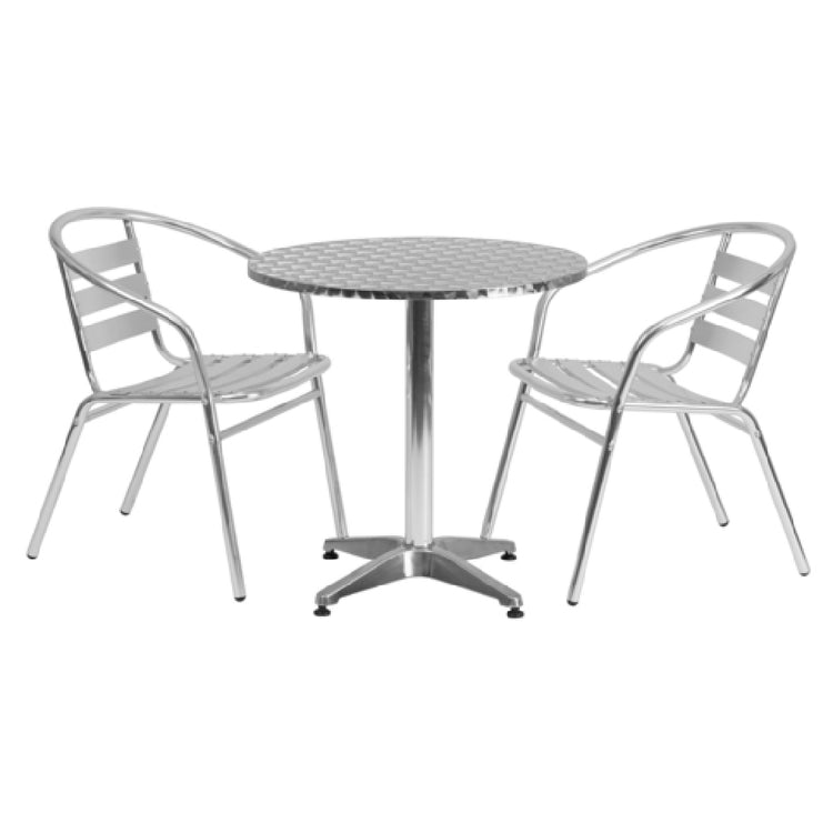 The Flash Furniture TLH-ALUM-28RD-017BCHR2-GG Table & Chair Set is a versatile furnishing solution for both residential and commercial environments. This set includes a round table with a diameter of 27-1/2 inches and a height of 27-1/2 inches, featuring a smooth stainless steel top, providing a sleek and modern aesthetic. The table is supported by a durable aluminum column and base, ensuring stability and longevity. Accompanying the table are two stacking chairs, each measuring 21-3/4 inches in width, 22 inches in depth, and 29 inches in height. These chairs are designed with a curved triple slat ladder back and a textured seat for added comfort, alongside integrated arms and cross braces for enhanced support and durability. The chairs’ aluminum frame contributes to their lightweight nature, facilitating easy mobility and storage. Additionally, plastic floor glides help protect surfaces from damage. Engineered for both indoor and outdoor use, this set is an ideal choice for a variety of settings, from bustling cafes to serene backyard patios. The Flash Furniture Table & Chair Set requires assembly and is shipped in two boxes, with in-stock items typically dispatched within 24 hours, offering a practical and stylish seating solution.