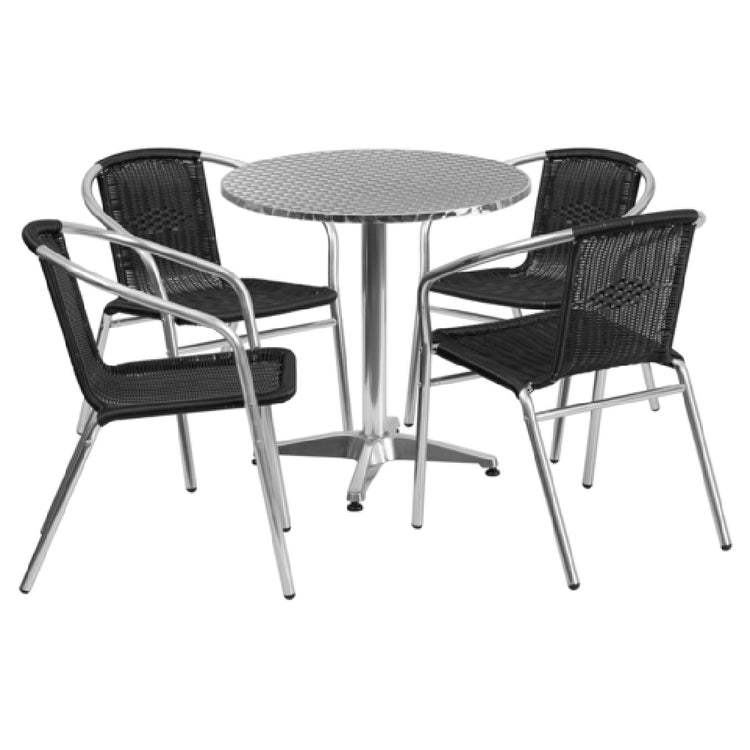 The Flash Furniture TLH-ALUM-28RD-020BKCHR4-GG Table & Chair Set is an expertly designed furniture piece that blends functionality with style for both commercial and residential environments. This set includes a round table measuring 27-1/2" in diameter and 27-1/2" in height, featuring a smooth stainless steel top supported by a sturdy aluminum column and base. The set is complemented by four stacking chairs, each with dimensions of 21-3/4"W x 22"D x 29"H. The chairs are designed with a curved back and integrated arms, providing comfort and support. The black rattan seat and back, coupled with an aluminum frame, offer a modern aesthetic and durability. The chairs are equipped with cross braces for added stability and plastic floor glides to protect flooring surfaces. Lightweight and practical, this set is suitable for both indoor and outdoor use, making it versatile for various settings. Assembly is required, and it ships in two boxes, with in-stock items typically ready to dispatch within 24 hours. This combination of materials and design caters to diverse markets, ensuring a robust and stylish addition to any dining or leisure space.