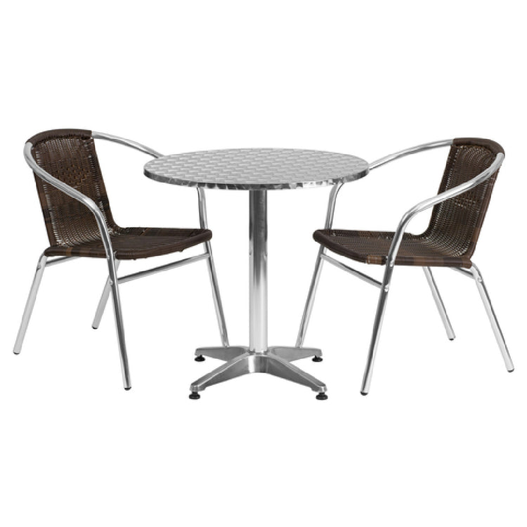 The Flash Furniture TLH-ALUM-28RD-020CHR2-GG Table & Chair Set is a versatile addition to both commercial and residential spaces, thoughtfully designed for indoor and outdoor use. It includes a round table with a smooth stainless steel top, measuring 27-1/2 inches in diameter and 27-1/2 inches in height, supported by a durable aluminum column and base. This set is complemented by two stacking chairs, each 21-3/4 inches wide, 22 inches deep, and 29 inches high, featuring a curved back and integrated arms for comfort. The chairs' dark brown rattan seat and back are supported by an aluminum frame with cross braces, offering a lightweight yet sturdy construction. Plastic floor glides help protect surfaces, making this set ideal for varied environments. The Flash Furniture set is shipped in two boxes and requires assembly, with in-stock items typically shipping within 24 hours. This table and chair set represents a practical solution for those seeking a blend of style, durability, and functionality, catering to businesses and homes alike.