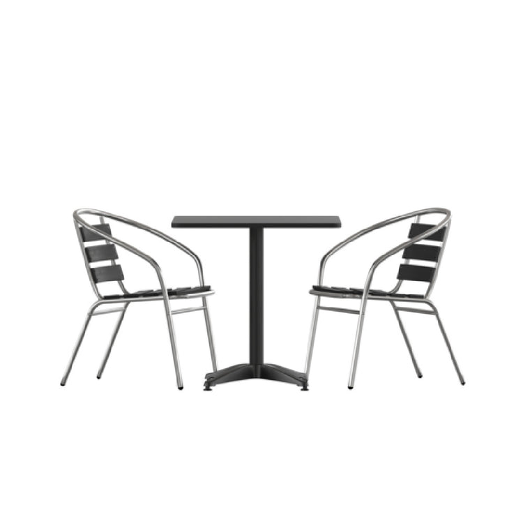 The Flash Furniture TLH-ALUM-28SQ-017BK2-GG Lila Table & Seat Set 27-1/2" x 27-1/2" square metal table is an expertly crafted piece of furniture, combining functionality and style. This compact set is ideal for both commercial and residential settings, offering a sleek, modern design that complements various decor themes. The table itself features a square metal top with dimensions of 27-1/2" by 27-1/2", providing ample space for dining or social activities. Accompanying the table are two black aluminum slat back chairs, which are not only stylish but also lightweight and easy to rearrange as needed. The use of aluminum for the chairs ensures durability and resistance to weather, making this set perfect for both indoor and outdoor use. The set's practical design and high-quality materials make it a valuable choice for cafes, patios, and home dining areas. With its combination of aesthetic appeal and durability, the Flash Furniture TLH-ALUM-28SQ-017BK2-GG Lila Table & Seat Set meets the needs of diverse market segments, from hospitality businesses seeking reliable and attractive furnishings to homeowners looking to enhance their living spaces with contemporary furniture solutions.