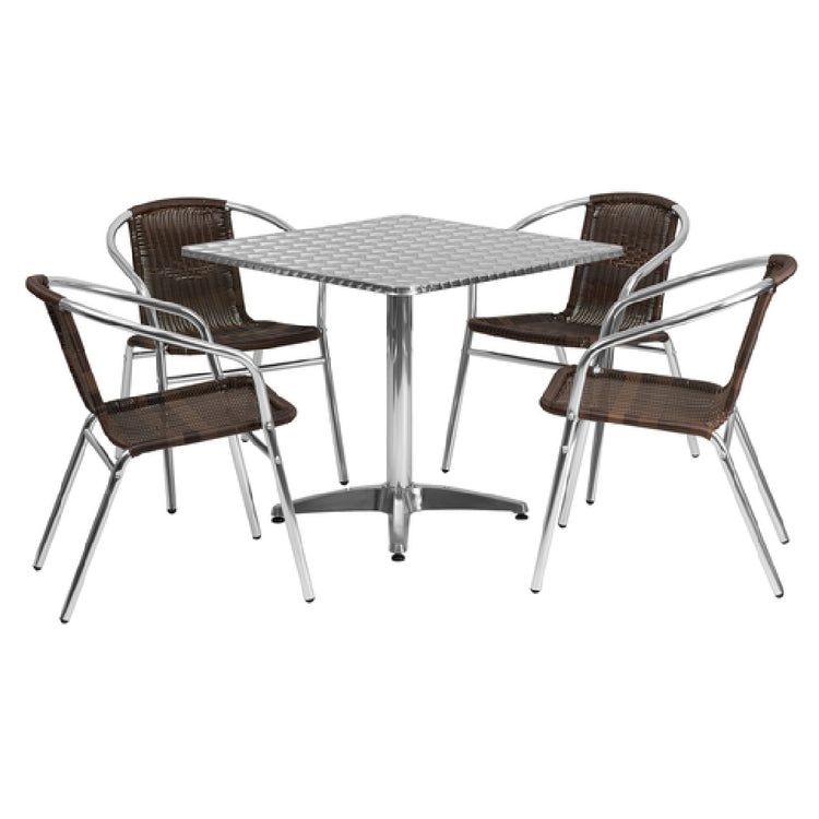 The Flash Furniture TLH-ALUM-32SQ-020CHR4-GG Table & Chair Set includes a square table and four stacking chairs, designed for both indoor and outdoor use in commercial and residential settings. The table measures 31-1/2 inches in width, 31-1/2 inches in depth, and 27-1/2 inches in height, featuring a smooth stainless steel top supported by an aluminum column and base. Complementing the table, each chair measures 21-3/4 inches in width, 22 inches in depth, and 29 inches in height, and is designed with a curved back and integrated arms. The chairs feature a dark brown rattan seat and back, enhanced with cross braces and an aluminum frame, providing both durability and style. Plastic floor glides on the chairs ensure easy movement and floor protection. This lightweight furniture set ships in two boxes and generally dispatches within 24 hours for in-stock items. Assembly is required upon receipt. The Flash Furniture set is a versatile solution, ideal for various market segments seeking durable, aesthetic, and practical furniture options for dining and social settings.
