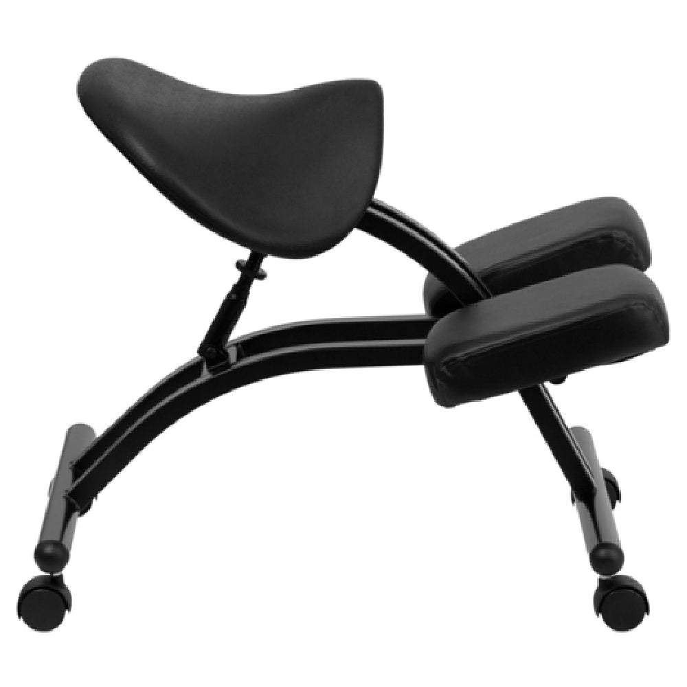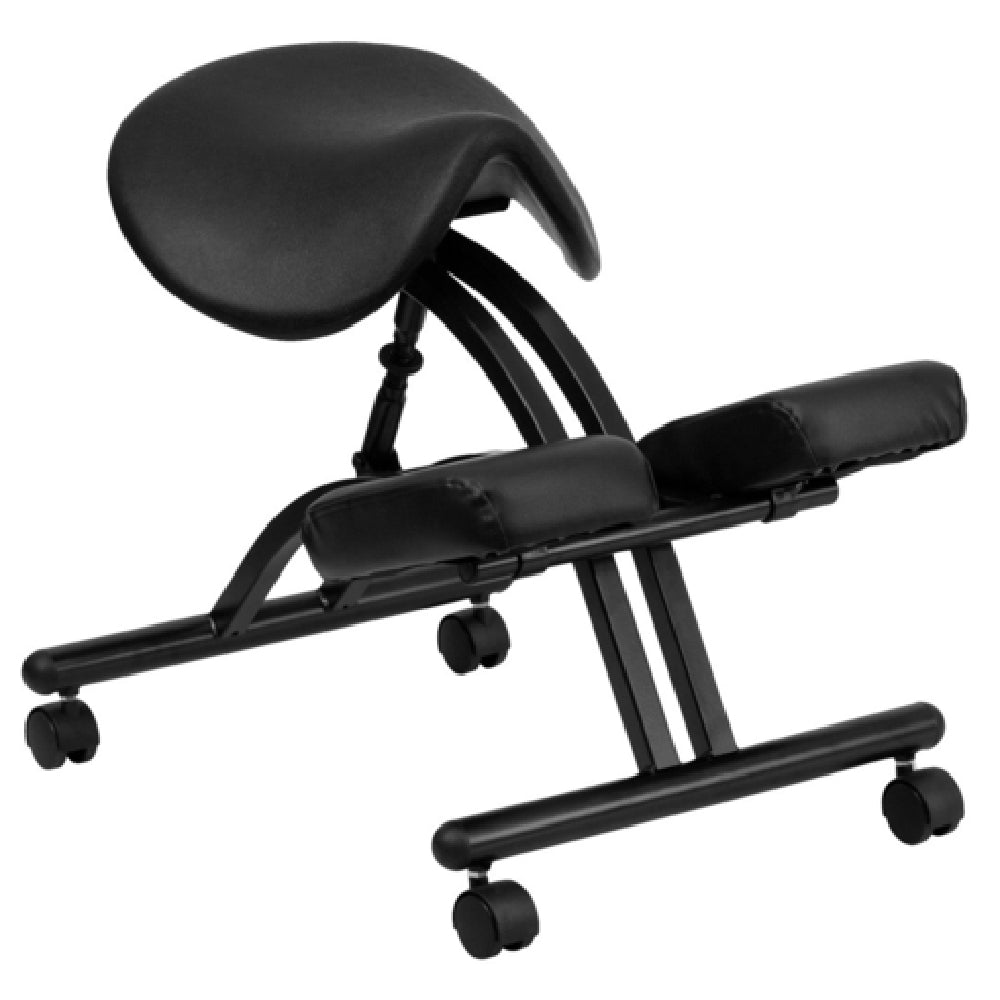 The Flash Furniture WL-1421-GG Ergonomic Kneeling Chair is a thoughtfully designed seating solution tailored for individuals seeking improved posture and comfort in various professional environments. Measuring 19-1/4" in width and 27-1/4" in depth, this chair provides ample space for diverse body types, making it suitable for a wide range of users. Its adjustable height feature, ranging from 21" to 28", allows personalization to accommodate different workstations and desk heights. With a weight capacity of 250 lb., this chair ensures stability and durability. The 19-1/4"W x 10-1/2"D x 2-1/4"H padded knee rest enhances comfort during extended use, while the saddle seat supports a natural ergonomic posture. The chair is upholstered in vinyl for easy maintenance and features a black powder-coated steel frame for robustness. Equipped with dual-wheel casters, this chair is mobile, facilitating smooth transitions across different areas of the workspace. The inclusion of CA117 fire retardant foam underscores its commitment to safety standards. Offered in a sleek black finish, this chair requires assembly upon receipt but promises to ship within 24 hours for in-stock items, addressing the needs of fast-paced work environments. Its design and functionality cater to office professionals and home users seeking ergonomic seating solutions.