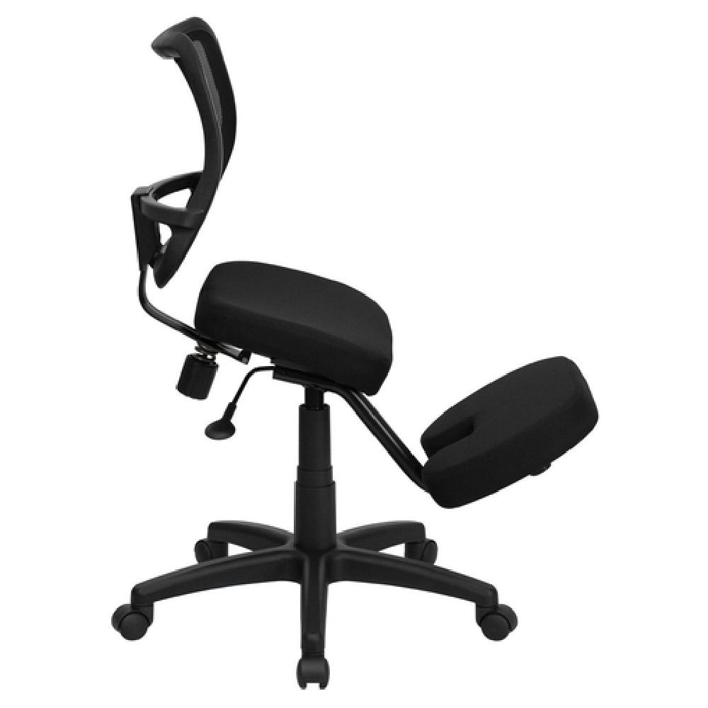 The Flash Furniture WL-3425-GG Ergonomic Kneeling Task Chair is a dynamic seating solution, adjustable from 38" to 42" in height, and supports up to 250 lbs, making it suitable for a diverse range of users looking for ergonomic comfort. Featuring a 16"W x 11-1/2"D x 2-1/2"H padded knee rest, the chair is designed to promote better posture by reducing stress on the spine. Its curved, ventilated mesh back and padded seat provide breathability and comfort, while the durable fabric upholstery adds a touch of style and resilience. The chair's heavy-duty black nylon base ensures stability, equipped with dual-wheel casters allowing for smooth mobility across various floor surfaces. Constructed with CA117 fire retardant foam, it meets safety standards for both home and office environments. The ergonomic design is particularly beneficial for professionals in tech industries, creatives, and students who spend long hours seated, offering an alternative to traditional seating arrangements and encouraging a healthier sitting position. Assembly is required, and in-stock items typically ship within 24 hours, ensuring a swift acquisition of this innovative chair for those seeking a balance of function, comfort, and modern design in their workspace.