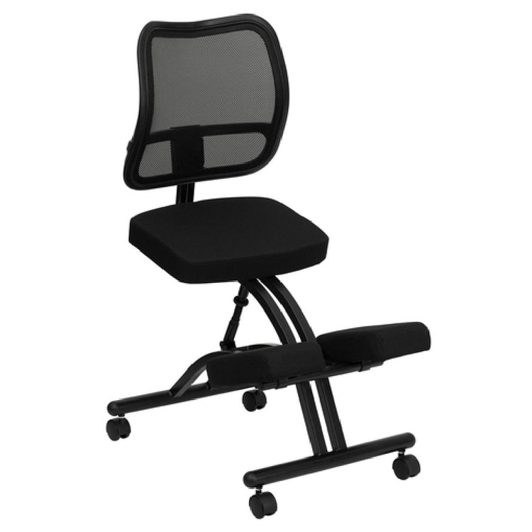The Flash Furniture WL-3520-GG Ergonomic Kneeling Chair is a versatile seating solution designed to enhance comfort and promote better posture. With dimensions of 20"W x 27-3/4"D and an adjustable height range from 41" to 42-1/2", this chair accommodates various user preferences and styles. It supports a weight capacity of up to 250 lbs, making it suitable for a wide range of individuals. The chair features an 18-1/2"W x 10-1/2"D x 2-1/2"H padded knee rest that ensures comfort during extended use. Its curved ventilated mesh back aids in maintaining airflow, while the padded seat, covered in fabric upholstery, provides additional comfort. The chair's black powder-coated scissor steel frame is both durable and stylish, complemented by dual-wheel casters for easy mobility across surfaces. The inclusion of CA117 fire retardant foam highlights its commitment to safety standards. Designed for various settings, whether in a home office, professional workspaces, or creative environments, this ergonomic kneeling chair aims to reduce strain and enhance productivity. Note that assembly is required, and in-stock items usually ship within 24 hours, ensuring prompt delivery for those eager to improve their ergonomic setup.