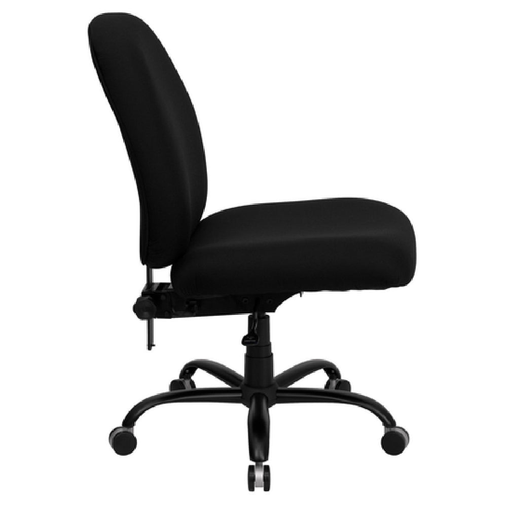 The Flash Furniture WL-715MG-BK-GG Hercules Series Big & Tall Executive Swivel Office Chair stands as a robust solution for diverse office environments, catering to individuals requiring enhanced support and comfort. With an adjustable height ranging from 40-1/4 inches to 45-1/4 inches, this chair accommodates various desk heights and user preferences. Its impressive 400 lb. weight capacity underscores its structural integrity, suitable for the big and tall demographic. The high back design and 3-inch adjustable height back offer superior ergonomic support, complemented by an infinite-locking back angle adjustment feature for personalized comfort. The 22-1/2-inch wide and 4-inch thick padded seat, upholstered in durable fabric, ensures long-lasting comfort during extended periods of use. Notably, the chair is designed without arms, offering flexibility for users preferring unrestricted lateral movements. Safety is prioritized with CA117 fire retardant foam, while the heavy-duty black metal base and dual-wheel carpet casters provide stability and ease of mobility. This executive swivel chair is also characterized by its quick assembly, often shipped within 24 hours, ensuring prompt setup in any professional setting. The Flash Furniture WL-715MG-BK-GG is a versatile addition to executive offices, call centers, and home workspaces, emphasizing durability and user-centric design.
