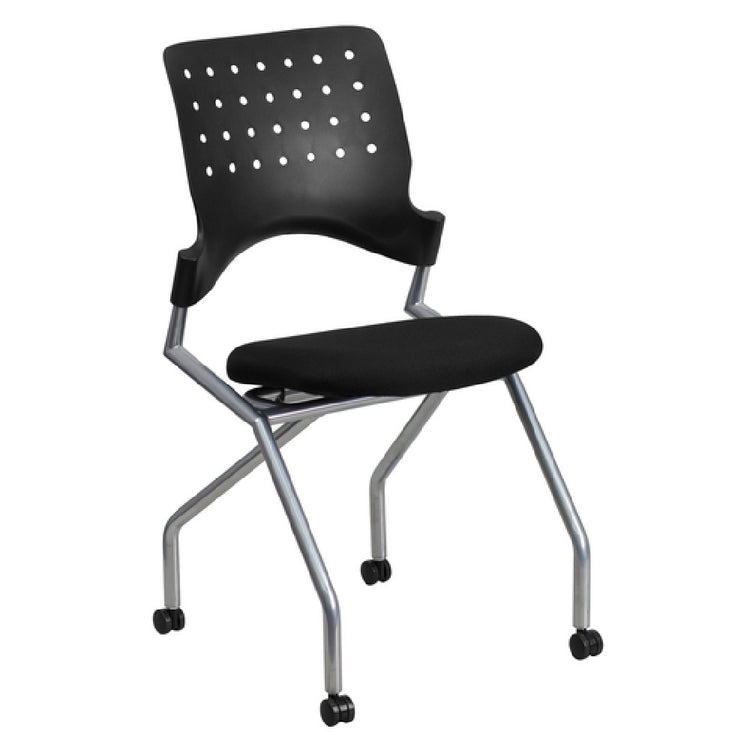 The Flash Furniture WL-A224V-GG Galaxy Mobile Nesting Chair - 250 Lb. Weight Capacity - is a versatile seating solution designed for modern office and conference spaces. Featuring a space-saver design, this chair is perfect for environments prioritizing flexibility and efficiency. It comes with a perforated plastic back that allows airflow for enhanced comfort during extended use, while the padded fabric upholstered flip-up seat offers adaptability and storage convenience. The absence of arms provides a minimalist aesthetic and freedom of movement, catering to diverse user preferences. Engineered with CA117 fire retardant foam, it ensures safety and compliance with fire safety standards. The chair's silver powder-coated frame adds durability and a sleek appearance, supporting a robust 250 lb. weight capacity. Equipped with heavy-duty casters, it enables effortless mobility across various flooring surfaces, making it an ideal choice for dynamic work environments. Available in black, this chair requires assembly upon delivery, and in-stock items are typically shipped within 24 hours, ensuring prompt availability for immediate needs. The Flash Furniture WL-A224V-GG Galaxy Mobile Nesting Chair is a practical and reliable seating option, uniquely tailored to support the ever-evolving demands of professional spaces.