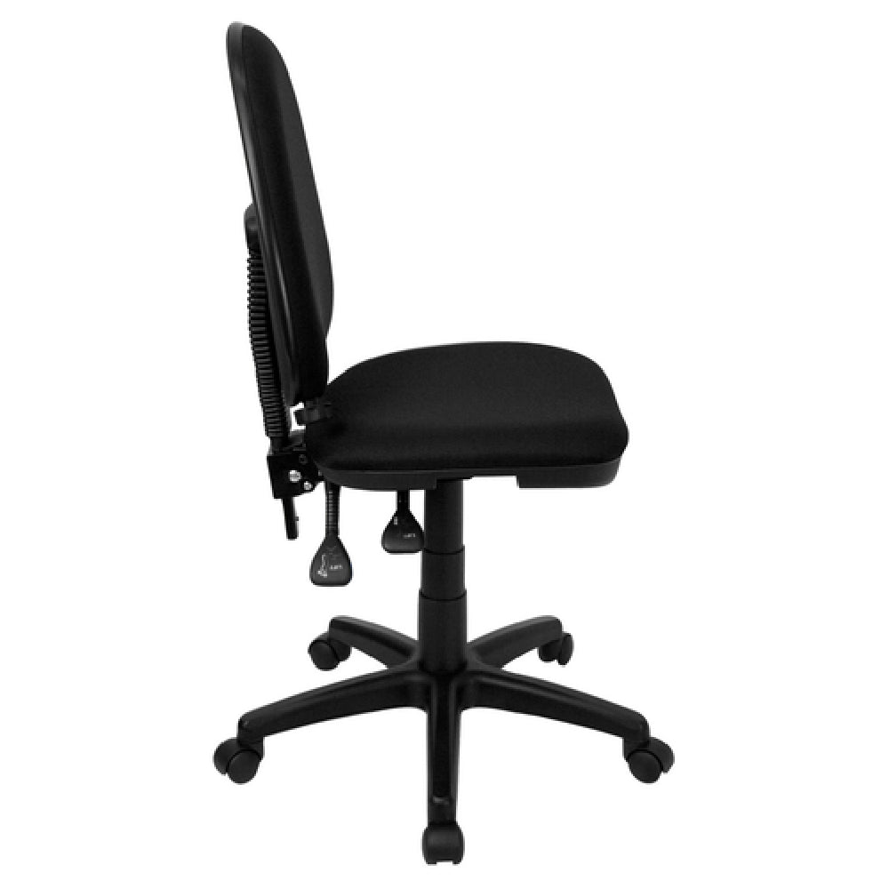 The Flash Furniture WL-A654MG-BK-GG Swivel Task Chair 35-1/2" To 39-1/2" Adjustable Height is a versatile seating solution designed for various professional environments. This chair accommodates up to 250 lbs and features a mid-back design that provides essential support for extended periods of use. Its contoured waterfall seat, upholstered in durable fabric, enhances comfort by promoting better posture. With a double paddle control mechanism, users can easily adjust the chair's height within a range of 35-1/2" to 39-1/2", while the back height can be adjusted by 4-1/2". The chair also includes an infinite-locking back angle adjustment, allowing for customization to meet individual ergonomic needs. The absence of arms offers greater flexibility and freedom of movement, particularly beneficial in task-focused settings. Constructed with CA117 fire-retardant foam and a heavy-duty black base, the chair combines safety with stability. Dual wheel casters enhance mobility across various floor surfaces. This chair is designed for easy assembly and is generally ready for shipment within 24 hours of ordering, ensuring rapid delivery for urgent requirements. Its multi-functional features make it suitable for diverse market segments within the office furniture industry, providing practical and reliable seating solutions.