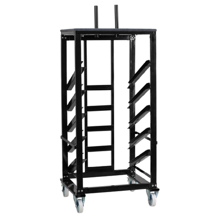Flash Furniture XA-24-COTA-DY-GG Cocktail/Pub Table Dolly is an efficient solution for transporting and storing cocktail table sets, with dimensions of 28-1/2"W x 23-1/4"D x 79-1/2"H. It accommodates up to ten 24-inch diameter cocktail table sets, utilizing five sloped shelves equipped with stops to ensure stability during transit. The dolly's gray carpeted platform is designed to protect table bases from scratches and damage. Constructed from a heavy-duty black steel frame, it provides durability and robustness required in commercial settings. The dolly is equipped with four 5-inch rubber casters, two of which are locking, providing both mobility and secure positioning when stationary. This design supports quick deployment and retrieval of tables, enhancing operational efficiency for event coordinators, restaurants, and rental companies. Notably, the dolly boasts fast shipping capabilities, with in-stock items typically dispatched within 24 hours, making it an appealing choice for businesses needing prompt solutions. This product is ideally suited for enterprises seeking reliable and organized methods of managing cocktail table logistics, ensuring seamless service delivery at events and functions.