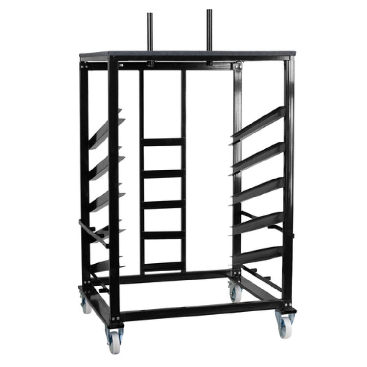 Flash Furniture XA-36-COTA-DY-GG Cocktail/Pub Table Dolly is expertly designed to enhance the efficiency of transporting and storing cocktail table sets. With dimensions of 40"W x 34"D x 79-1/2"H, this dolly is engineered to hold up to ten 36-inch diameter cocktail table sets. It includes five sloped shelves equipped with stops to ensure each table set remains securely in place during movement. The gray carpeted platform serves as a protective base for the tables, safeguarding against scratches and damage. Constructed with a heavy-duty black steel frame, this dolly promises durability and long-term use, even in high-demand environments. The dolly's mobility is enhanced by four 5-inch rubber casters, two of which are lockable to provide stability during loading and unloading. This feature makes it particularly useful for event venues, hotels, and banquet facilities where space and time efficiency are paramount. The Flash Furniture XA-36-COTA-DY-GG Cocktail/Pub Table Dolly is a reliable, robust solution for businesses seeking to optimize their storage and transportation of cocktail tables, reflecting a commitment to quality and practicality in their operational infrastructure. In-stock items are typically shipped within 24 hours, ensuring quick availability to meet urgent needs.