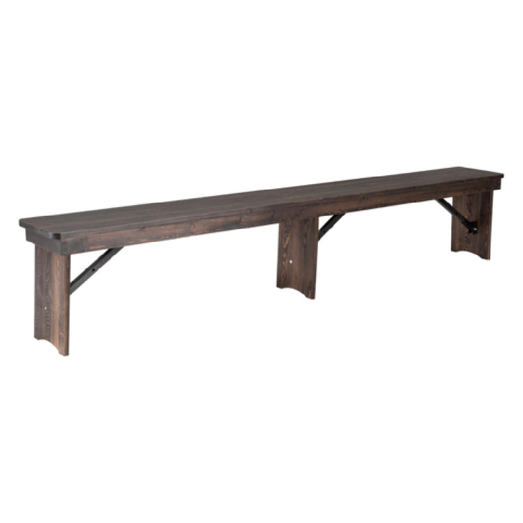 The Flash Furniture XA-B-96X12-L-MG-GG Hercules Series Folding Rustic Farm Bench is designed to combine rustic aesthetics with robust functionality, making it suitable for both commercial and residential environments. This bench features a 96-inch-wide by 12-inch-deep seating area and stands at a height of 17-1/2 inches, ensuring ample seating space for up to four adults. The bench is constructed with a solid pine plank top that is 3/4 inches thick, offering durability and a classic farmhouse appeal. Supported by 8-1/4-inch pine legs and reinforced with 16-gauge white steel posts, this bench delivers both stability and a charming antique mahogany finish. The design emphasizes versatility and practicality, as it is capable of catering to various segments in the furniture industry, including event venues, restaurants, and home decor. The bench's folding mechanism allows for easy storage and transportation, making it a pragmatic choice for spaces that require flexible seating solutions. Moreover, the bench's rustic charm and solid construction make it a valuable addition for those seeking both style and functionality. With in-stock items usually shipping within 24 hours, this bench ensures prompt delivery and immediate use for your seating needs.