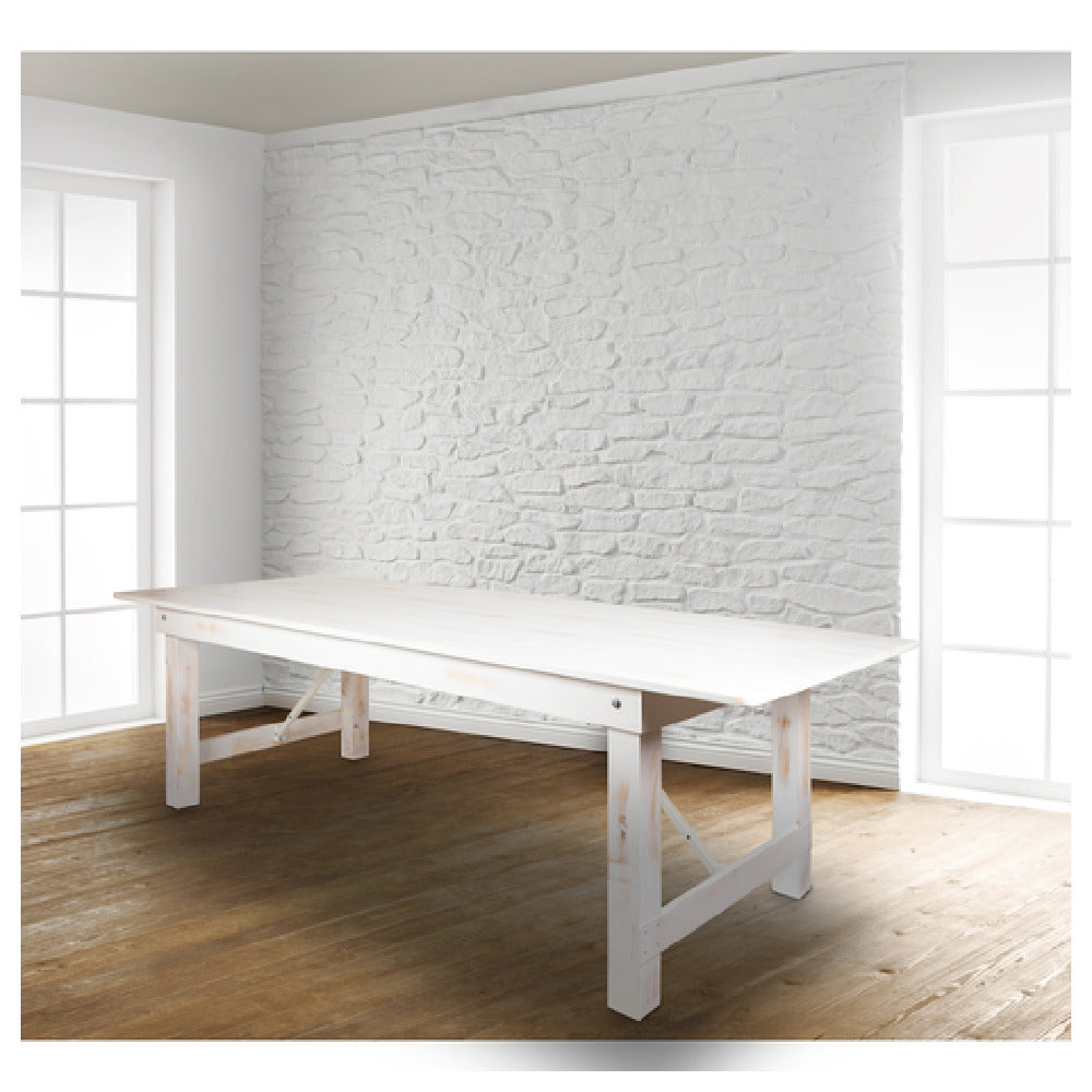 The Flash Furniture XA-F-108X40-WH-GG Hercules Series Folding Rustic Farm Table is a versatile piece characterized by its impressive dimensions of 108"W x 40"D x 30"H, accommodating up to 10 adults comfortably. This table features a 7/8" thick solid pine plank top, which provides a sturdy and rustic aesthetic suitable for both commercial and residential environments. Its robust design includes 3-1/2" thick legs and supportive 16-gauge white steel posts, ensuring stability and durability for varied usage. The antique white finish adds a touch of elegance to any setting, making it a fitting centerpiece for events ranging from weddings to business conferences. This table is designed with practicality in mind, featuring a folding mechanism for easy storage and transport, enhancing its utility for venues requiring flexible furniture arrangements. Available for quick shipping, with in-stock items usually dispatched within 24 hours, the Flash Furniture XA-F-108X40-WH-GG is a reliable choice for those seeking a blend of functionality and style, catering to a broad spectrum of market segments in the hospitality and event management industries.