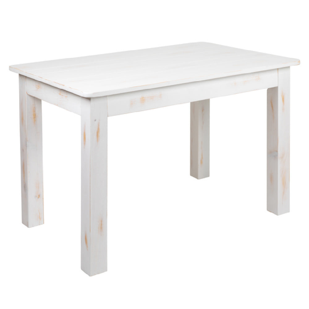The Flash Furniture XA-F-46X30-WH-GG Hercules Series Farm Dining Table is a finely crafted piece of furniture that combines aesthetic appeal with functional precision. Measuring 46 inches in width, 30 inches in depth, and standing at a height of 29-1/2 inches, this rectangular dining table is ideally sized to accommodate up to four adults comfortably, making it a versatile choice for both intimate family meals and small gatherings. The table features a plank top with a 1-inch edge, supported by a 4-inch apron, and is equipped with sturdy square legs that ensure stability and durability. Constructed from solid pine, this table is not only robust but also boasts an antique rustic white finish that enhances its visual charm, making it a standout piece in any dining setting. This combination of classic design and solid construction makes it particularly appealing to homeowners seeking a rustic or farmhouse aesthetic, small commercial dining establishments aiming to create a homey atmosphere, and interior designers looking for pieces that provide both form and function. The Flash Furniture farm dining table is a distinguished piece in the Hercules Series, synonymous with strength and style, offering a timeless solution for diverse dining environments.