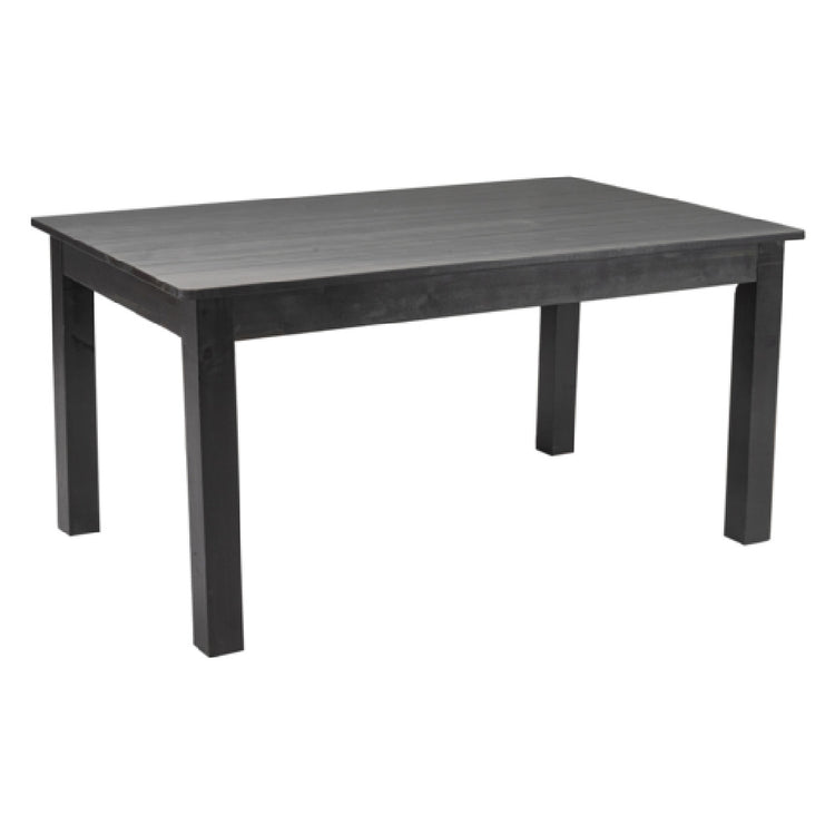 The Flash Furniture XA-F-60X38-BW-GG Hercules Series Farm Dining Table is a meticulously crafted piece that combines rustic charm with functional design, making it a versatile addition to various settings. With dimensions of 60 inches in width, 38 inches in depth, and 29-1/2 inches in height, this rectangular dining table serves as an ideal centerpiece for family meals or gatherings, comfortably seating up to six adults. The table features a plank top with a 1-inch edge and a 4-inch apron, offering a robust and sturdy construction that enhances its durability and aesthetic appeal. Its square legs provide stability, ensuring the table remains firmly in place even during lively meals. Crafted from solid pine, the table is finished with a rustic black wash, adding a touch of elegance and timelessness to any dining space. This design not only fits well in traditional farmhouse settings but also complements modern rustic and industrial interiors. The Flash Furniture Hercules Series Farm Dining Table stands out in the market for its impeccable craftsmanship and ability to blend seamlessly into both residential and commercial environments, catering to diverse market segments looking for quality and style in dining furniture.