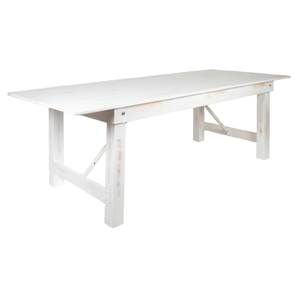 The Flash Furniture XA-F-96X40-WH-GG Hercules Series Folding Rustic Farm Table is a versatile addition to both commercial and residential settings, characterized by its robust construction and functional design. Measuring 96 inches in width, 40 inches in depth, and 29-1/2 inches in height, this table provides ample space for gatherings, comfortably seating up to 8 adults. The tabletop is made of a 7/8-inch thick white solid pine plank, offering a rustic aesthetic that complements various interior styles. Supporting this sturdy top are 3-1/2-inch thick legs paired with 16 gauge white steel posts, ensuring durability and stability across different environments. This combination of materials not only enhances the table's structural integrity but also contributes to its rustic charm, making it suitable for events, dining, or workspace scenarios. The practical design allows it to be easily folded and transported, catering to dynamic spaces that require flexibility. With its quick shipping options, typically within 24 hours for in-stock items, the Flash Furniture Hercules Series table is an efficient solution for those seeking reliable and stylish furniture that adapts to both personal and professional needs.