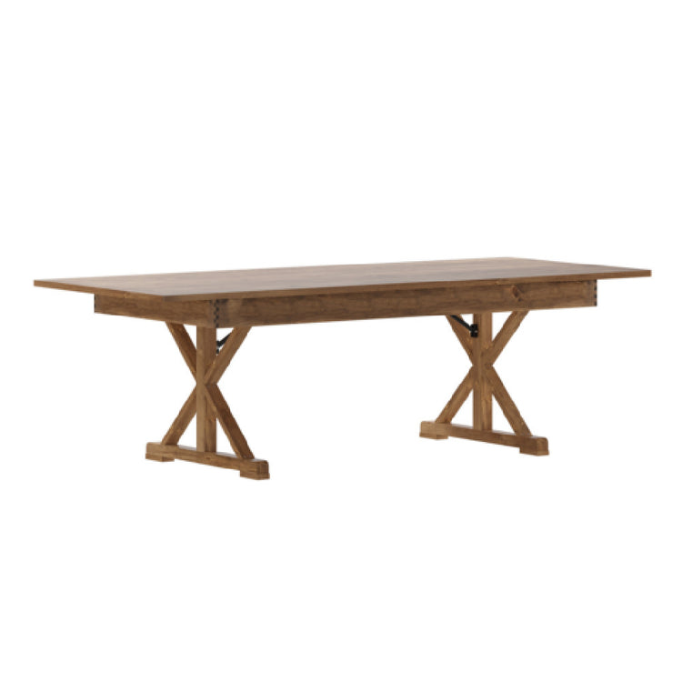 The Flash Furniture XA-F-96X40-XLEGS-GG Hercules Folding Farm Table 8' X 40" Rectangular is a distinguished piece of furniture crafted for those who seek versatility and style in their event or dining setup. This table is meticulously constructed with antique rustic solid pine, offering both aesthetic appeal and durability that stands out in any setting. It features a generous surface area of 8 feet by 40 inches, making it an ideal choice for large gatherings, whether in residential or commercial environments. The unique X-legs design ensures stability and strength, supporting a variety of uses from banquets to farm-to-table dining experiences. Its foldable nature provides convenient storage and transport, catering to event planners and venues that require adaptability. The rustic charm of the solid pine construction adds an elegant yet rustic character, appealing to both modern and traditional decor preferences. This table's robust build and functional design make it an attractive option for wedding venues, restaurants, and even home dining areas that require a blend of practicality and aesthetics. The Flash Furniture XA-F-96X40-XLEGS-GG is a testament to quality craftsmanship, combining size, style, and functionality to meet diverse market needs in the furniture industry.