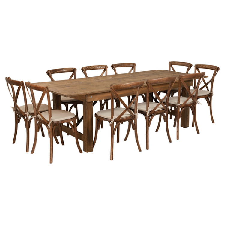 The Flash Furniture XA-FARM-13-GG Hercules Series Farm Table Set - Antique Rustic Design embodies a blend of durability and rustic charm that caters to both commercial and residential settings. This set includes ten substantial folding tables, each measuring 96 inches wide by 40 inches deep and standing 30 inches tall, featuring a rectangular plank top supported by a solid pine wood base. The tables are equipped with leg locks underneath the top and push-in/push-out leg pins for enhanced stability and ease of setup. Complementing the tables, the set also comprises ten stacking chairs, each 20-1/4 inches wide, 23-1/4 inches deep, and 35 inches high, constructed with pecan finish ash wood cross back, seat, and frame. The chairs boast a substantial weight capacity of 400 pounds and feature included seat cushions for added comfort. Plastic floor glides protect surfaces during use. The entire ensemble is carefully designed to meet the needs of varying environments, shipped in six boxes to ensure swift delivery, typically within 24 hours. The seamless integration of rugged construction and aesthetic appeal makes this set a versatile choice, perfectly suited for various industry segments from hospitality to event management.