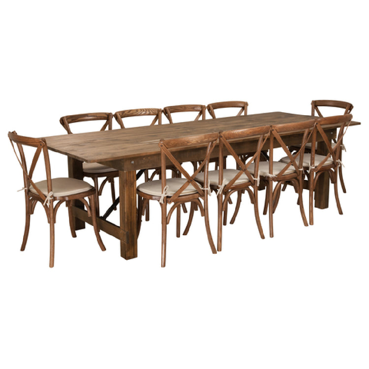 The Flash Furniture XA-FARM-15-GG Hercules Series Farm Table Set features an antique rustic design that adds charm and functionality to various settings. This set includes a rectangular folding table measuring 108 inches wide, 40 inches deep, and 30 inches high, constructed with solid pine for durability. The plank top and wood base offer a classic aesthetic, while practical features such as leg locks and push in/push out leg pins enhance stability and ease of use. Accompanying the table are ten stacking chairs, each with dimensions of 20-1/4 inches wide, 23-1/4 inches deep, and 35 inches high, and a notable weight capacity of 400 pounds. The chairs are crafted from pecan finish ash wood and include cross backs, seats, and frames with additional seat cushions for comfort. Plastic floor glides protect flooring surfaces, making this set ideal for both commercial and residential use. The product is shipped in six boxes and is typically available for shipping within 24 hours, offering convenience and reliability. The robust construction and thoughtful design make this table set a versatile choice for hosting events, dining experiences, or as a staple in restaurant settings, providing a blend of style and practicality.