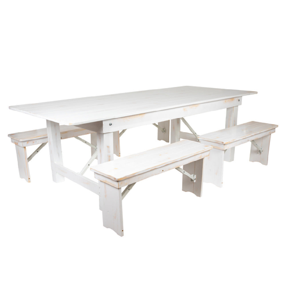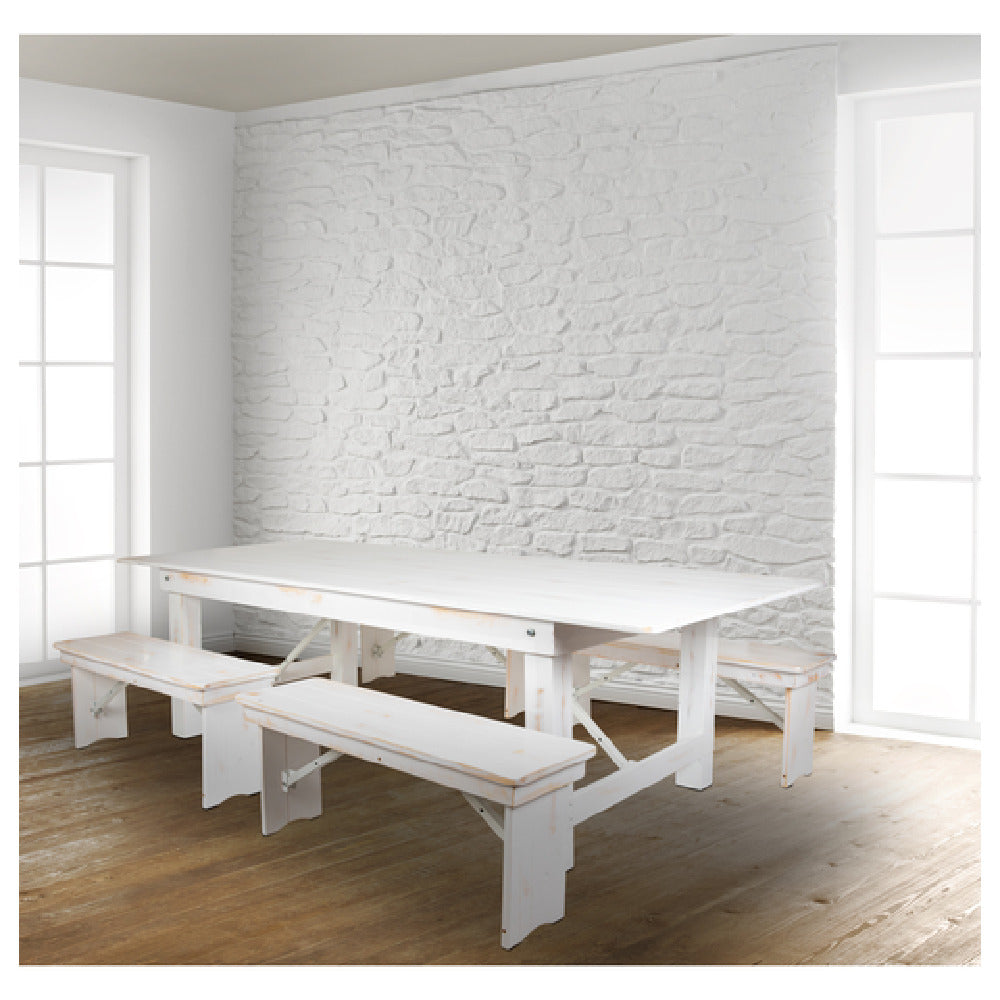 The Flash Furniture XA-FARM-2-WH-GG Hercules Series Folding Farm Table Set - Antique Rustic White Design is a highly functional and aesthetically appealing set ideal for both commercial and residential environments. This versatile set includes a spacious 96-inch wide, 40-inch deep, and 30-inch high rectangular folding table, crafted with a plank top and supported by a sturdy wood base. Constructed from solid pine, the table ensures durability and timeless appeal, with leg locks beneath the top and push in/push out leg pins for added stability. Accompanying the table are four benches, each measuring 40-1/4 inches wide, 12 inches deep, and 17-3/4 inches high, providing ample seating for up to eight adults. The antique rustic white finish adds a touch of elegance, making it suitable for a variety of settings, from cozy home gatherings to sophisticated event venues. Shipped in five boxes, this set usually ships within 24 hours, ensuring prompt delivery for your needs. The Flash Furniture Hercules Series is a perfect choice for those seeking a blend of functionality and style, with its robust construction and classic design catering to different segment markets within the furniture industry.