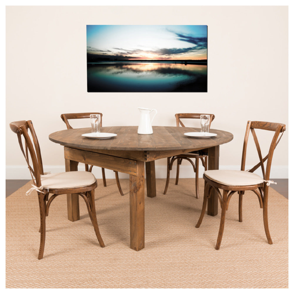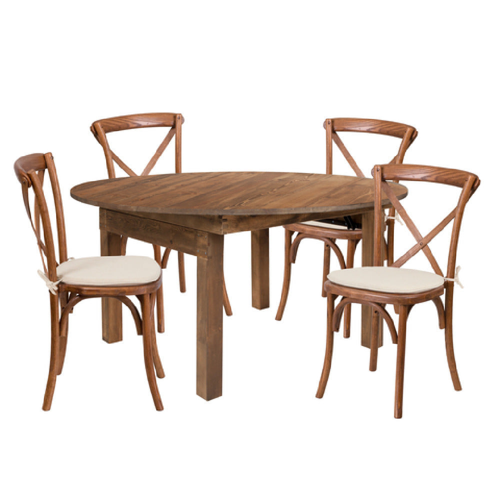 The Flash Furniture XA-FARM-20-GG Hercules Series Farm Table and Chair Set is a versatile and stylish addition to any rustic or antique-themed space. This set includes a 60-inch diameter by 30-inch high folding table, featuring a round, plank top made from solid pine with a rustic stained finish that exudes charm and elegance. Accompanying the table are four cross-back stacking chairs, each designed to support up to 400 pounds, highlighting their robust construction. These chairs, crafted with an ash wood seat and frame, can be stacked up to 8 chairs high, ensuring convenient storage and space management. Finished in a pecan stain, the entire set offers a cohesive and complementary aesthetic. This product is ideal for various segment markets, including hospitality venues, event spaces, or home dining areas, where both functionality and a timeless look are desired. The meticulous craftsmanship and quality materials used in the Flash Furniture XA-FARM-20-GG Hercules Series make it a valuable asset for any setting seeking to combine practicality with a charming rustic appearance.