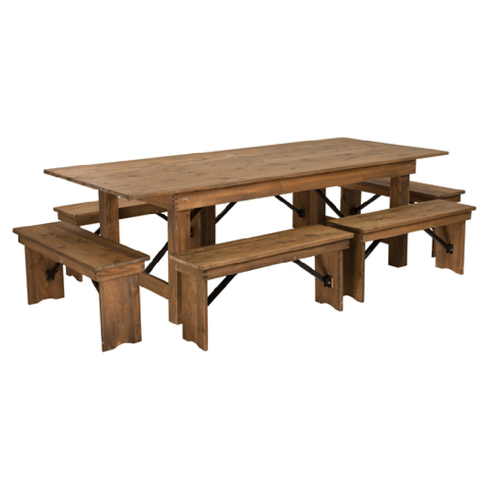 The Flash Furniture XA-FARM-3-GG Hercules Series Folding Farm Table Set Antique Rustic Design is a versatile addition to both commercial and residential environments. This set, featuring an antique rustic design, accommodates up to 12 adults, making it ideal for large gatherings. Central to this set is a 96-inch-wide by 40-inch-deep by 30-inch-high rectangular folding table. It boasts a plank top and sturdy wood base, constructed from solid pine for enhanced durability. The table's design includes leg locks underneath and push in/push out leg pins for stability and ease of use. Complementing the table are six benches, each measuring 40-1/4 inches wide, 12 inches deep, and 17-3/4 inches high, providing ample seating. The set is shipped in seven boxes and is usually dispatched within 24 hours of order. Its design and construction make it suitable for a range of settings, from rustic-themed events to everyday dining situations, offering a blend of practicality and aesthetic appeal.