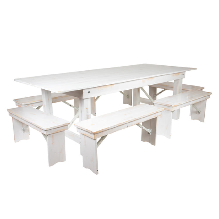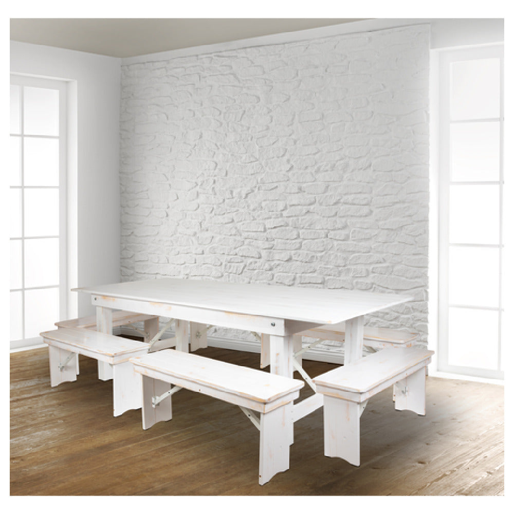 Flash Furniture XA-FARM-3-WH-GG Hercules Series Folding Farm Table Set Antique Rustic White Design is an elegantly designed furniture piece that caters to both commercial and residential settings. This set includes a sizable rectangular folding table measuring 96 inches in width, 40 inches in depth, and 30 inches in height, providing ample space to seat up to 12 adults comfortably. Its plank top and solid pine wood construction ensure durability and a rustic aesthetic, making it a standout feature in any environment. The table's sturdy wood base is complemented by leg locks underneath the top and push in/push out leg pins, enhancing stability and ease of use. Accompanying the table are six benches, each measuring 40-1/4 inches in width, 12 inches in depth, and 17-3/4 inches in height, all designed to match the table's rustic charm. This furniture set is delivered in seven boxes and is usually shipped within 24 hours, making it a practical choice for those seeking immediate solutions. Its versatility and robust construction make it ideal for diverse industry segments, providing an appealing blend of style and functionality.