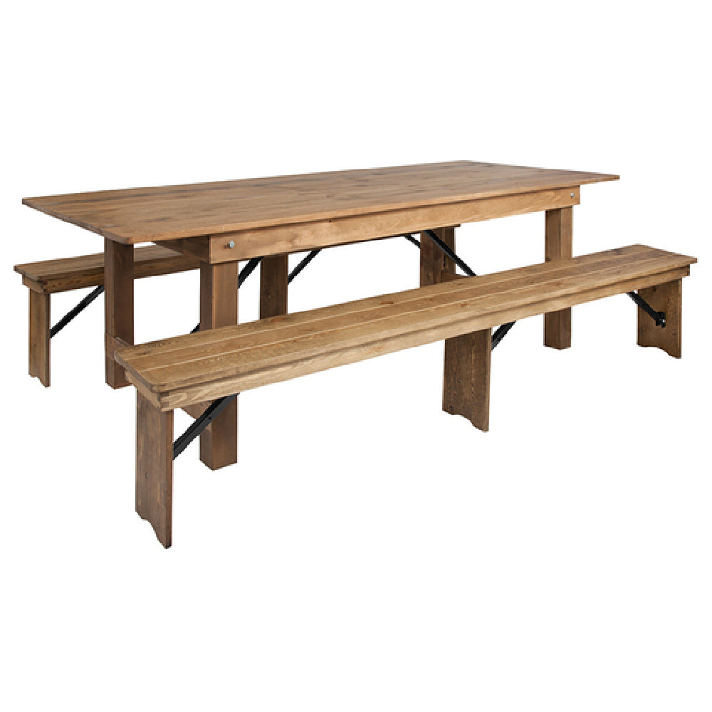 The Flash Furniture XA-FARM-4-GG Hercules Series Folding Farm Table Set is a versatile addition to any setting, combining functionality with a charming antique rustic design. This set is expertly crafted to seat up to 8 adults, making it suitable for both commercial and residential applications. The centerpiece of the set is a robust folding table with dimensions of 96 inches in width, 40 inches in depth, and 30 inches in height. The table's rectangular plank top and wood base are constructed from solid pine, ensuring durability and a classic aesthetic. For added convenience, the table features leg locks underneath and push-in/push-out leg pins, allowing for easy setup and stability. Accompanying the table are two benches, each measuring 96 inches in width, 12 inches in depth, and 17-3/4 inches in height, perfectly complementing the table's design. Shipped in five boxes, this set is usually in stock and ships within 24 hours, offering a swift solution for furnishing dining or event spaces. This folding farm table set appeals to a wide range of market segments, providing a blend of aesthetic charm and practical utility that enhances any environment.