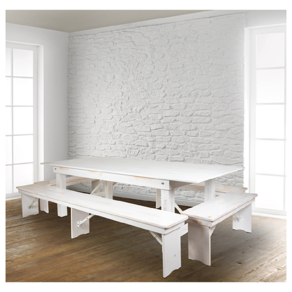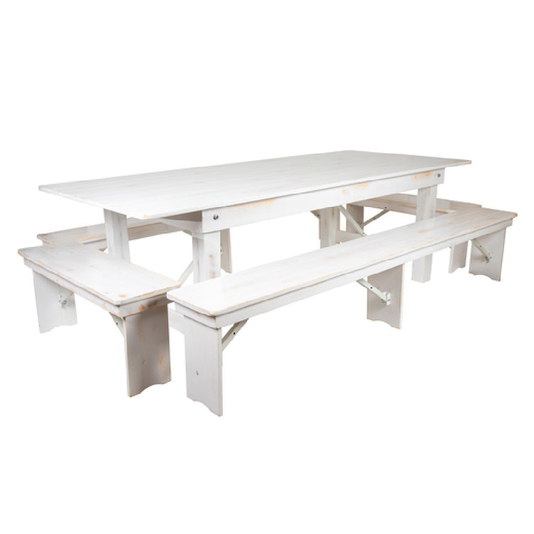 The Flash Furniture XA-FARM-5-WH-GG Hercules Series Folding Farm Table Set - antique rustic white design, is an expertly crafted furniture solution, designed for both commercial and residential use. This set comfortably seats up to eight adults, making it ideal for various gatherings. At the heart of this set is a rectangular plank top table measuring 96"W x 40"D x 30"H, constructed with a solid pine wood base that ensures durability and stability. It features leg locks underneath the top and push in/push out leg pins for enhanced security. The set includes two larger benches measuring 96"W x 12"D x 17-3/4"H and two smaller benches at 40-1/4"W x 12"D x 17-3/4"H, providing versatile seating options. This well-designed set is shipped in five boxes and typically ships within 24 hours when in stock, ensuring a quick and efficient delivery process. The antique rustic white finish adds a touch of elegance, appealing to those who appreciate a classic yet functional aesthetic. The unique folding feature of this table set allows for easy transport and storage, making it a practical choice for diverse settings ranging from intimate home environments to bustling commercial spaces.