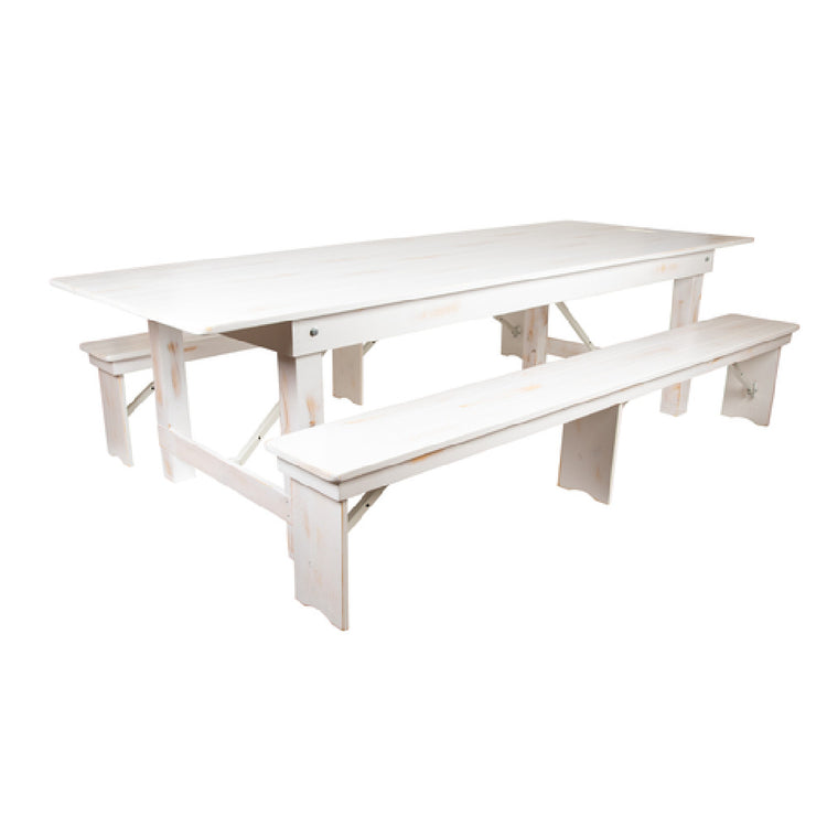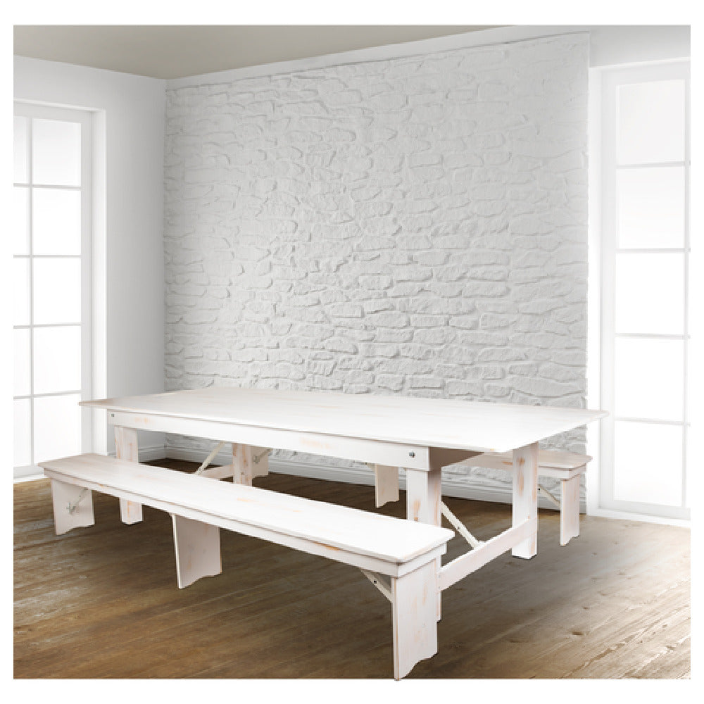 The Flash Furniture XA-FARM-6-WH-GG Hercules Series Folding Farm Table Set combines functionality with an antique rustic white design, offering a versatile solution for both commercial and residential spaces. This robust set includes a substantial 108" wide, 40" deep, and 30" high rectangular folding table, crafted with a plank top and a solid pine wood base, ensuring durability and aesthetic appeal. The table is constructed with practical features, such as leg locks underneath the top and push-in/push-out leg pins, enhancing stability and ease of use. Accompanying the table are two 96" wide, 12" deep, and 17-3/4" high benches, providing ample seating for up to eight adults. The set's modular design allows it to be effortlessly folded and stored, catering to dynamic space requirements in event venues, dining areas, or outdoor settings. Shipped in five boxes, this table set is typically in stock and usually ships within 24 hours, making it a convenient choice for last-minute arrangements. Its antique rustic white aesthetic adds a touch of elegance, while its sturdy construction ensures it meets the demands of high-use environments, making it a valuable addition to any setting seeking both style and functionality.
