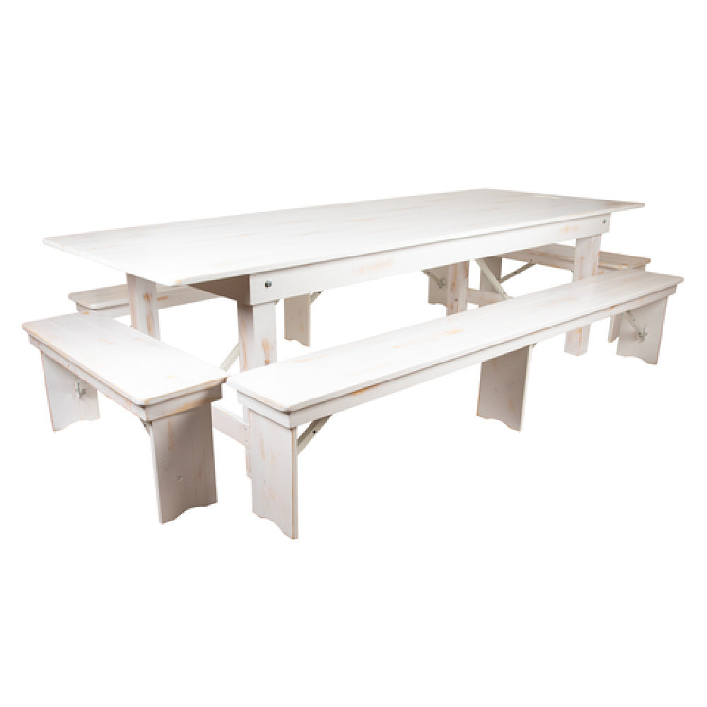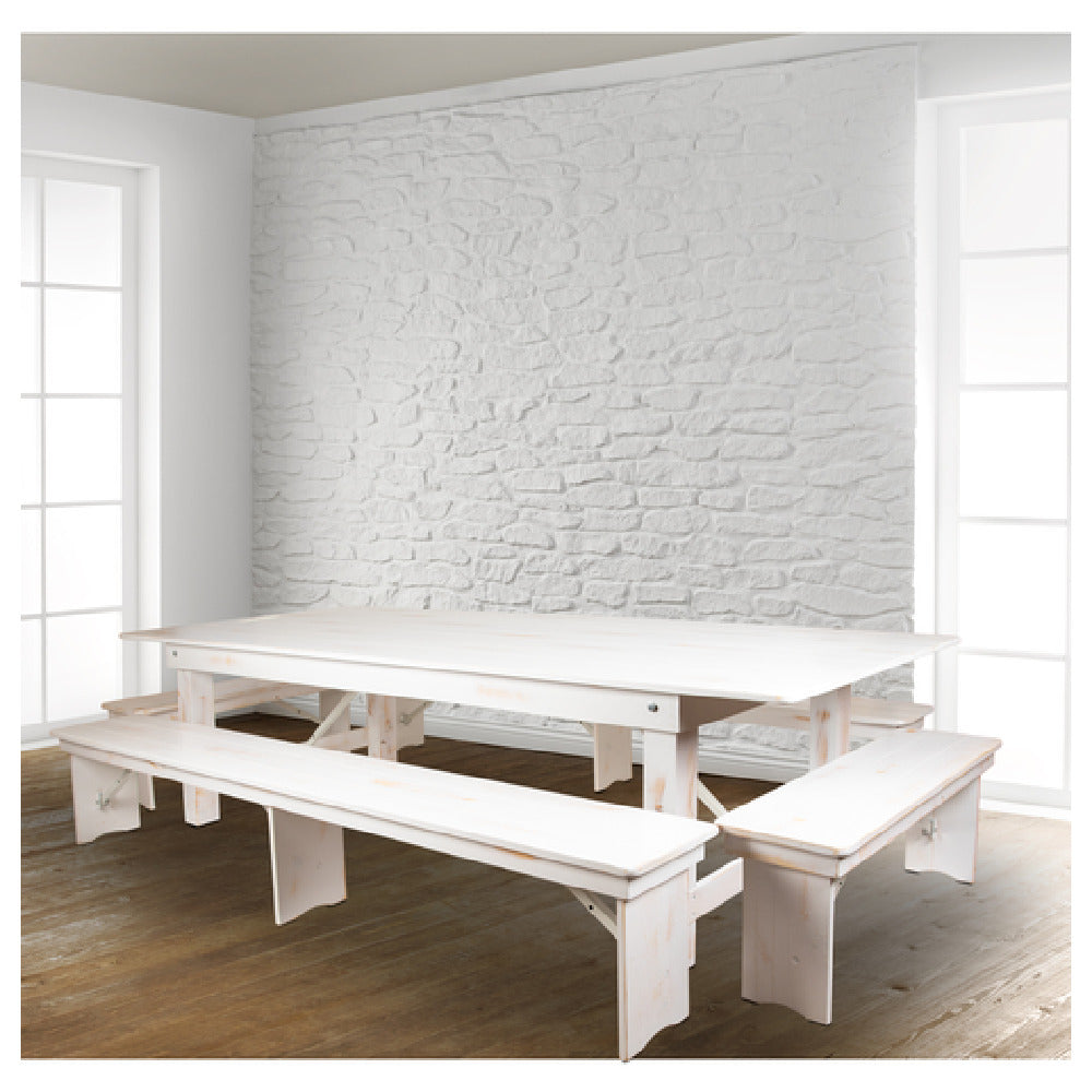 Flash Furniture XA-FARM-7-WH-GG Hercules Series Folding Farm Table Set Antique Rustic White Design is a versatile furniture solution offering functionality combined with a charming rustic aesthetic. This set is designed to seat up to 8 adults comfortably, making it suitable for both commercial and residential settings, such as restaurants, event spaces, and home gatherings. The centerpiece of this set is a 108"W x 40"D x 30"H folding table featuring a rectangular plank top constructed from solid pine, ensuring durability and longevity. The table is equipped with leg locks underneath the top and push-in/push-out leg pins, enhancing stability and ease of use. Accompanying the table are two 96"W x 12"D x 17-3/4"H benches and two 40-1/4"W x 12"D x 17-3/4"H benches, offering ample seating options. The set is shipped in five boxes and is typically available for shipping within 24 hours, ensuring quick delivery. The antique rustic white design adds a touch of elegance, making it a standout piece for any environment that calls for a blend of practicality and style. With its solid wood base and folding capabilities, this table set is both a space-saving and aesthetically pleasing choice for diverse market segments.