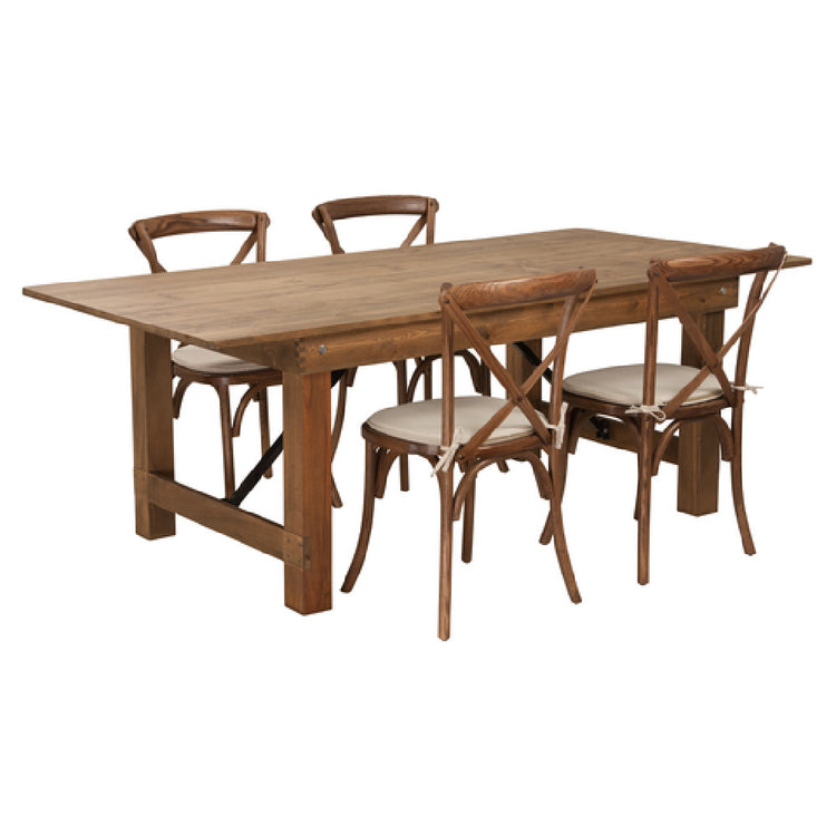 The Flash Furniture XA-FARM-8-GG Hercules Series Farm Table Set combines antique rustic aesthetics with practical design for both residential and commercial settings. This set features a robust 84"W x 40"D x 30"H folding table with a rectangular plank top and wood base, crafted from solid pine for durability. It includes unique leg locks underneath the table top and push in/push out leg pins, enhancing its stability and ease of use. Accompanying the table are four 20-1/4"W x 23-1/4"D x 35"H stacking chairs, each with a 400 lb. weight capacity, making them suitable for various body types. The chairs are made from pecan finish ash wood, with cross-back design and cushioned seats, offering comfort and style. Plastic floor glides ensure the chairs can be moved without damaging floors. This set is shipped in three boxes and typically dispatches within 24 hours, reflecting its availability for quick delivery. Designed for a wide array of environments, from intimate dining rooms to bustling event spaces, its rustic appeal and solid construction make it a versatile choice, fitting seamlessly into any setting that values both aesthetic charm and functional design.