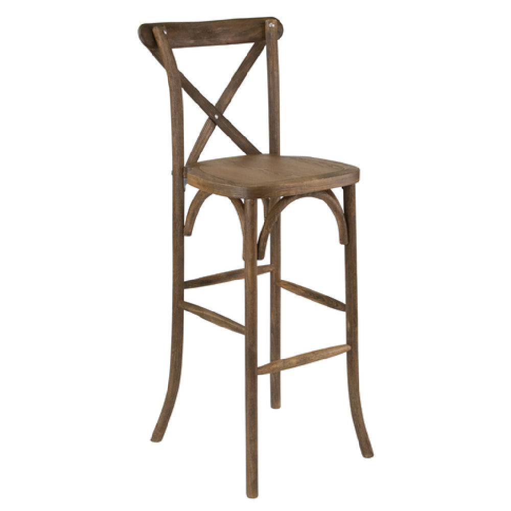 The Flash Furniture XA-X-BAR-GO-GG Hercules Series Stacking Bar Stool boasts a remarkable 600 lb. weight capacity, positioning it as a robust choice for both commercial and residential settings. This armless stool features a distinctive cross-back design and a sophisticated wood seat, complemented by a sturdy wood frame with a dark antique finish. Its downward "U" design ensures structural integrity while providing an elegant aesthetic appeal. Designed for versatility, the stool incorporates a built-in footrest and floor glides, promoting comfort and ease of movement across various floor types. A notable feature is its stacking capability, allowing up to five chairs to be stacked high for efficient storage solutions in bustling environments. Whether utilized in a trendy cafe or a cozy home bar, the Hercules Series stool arrives fully assembled and typically ships within 24 hours, underscoring its convenience and readiness for immediate use. Its blend of durability, design, and functionality makes it a valued asset in diverse market segments, addressing the unique demands of high-traffic commercial areas and stylish residential spaces alike.