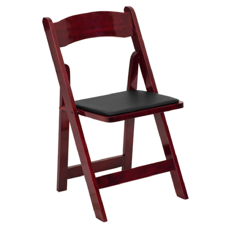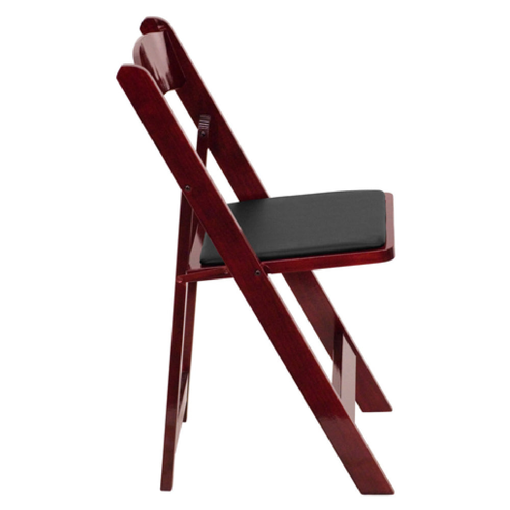 The Flash Furniture XF-2903-MAH-WOOD-GG Hercules Series Folding Chair embodies a blend of functionality and style, making it a versatile seating solution for both indoor and outdoor commercial environments. This lightweight chair is distinguished by its construction from durable beechwood, providing strength and stability while maintaining a manageable weight for easy transport and setup. The chair's mahogany finish, enhanced with a clear lacquer varnish, adds a touch of elegance, making it suitable for upscale events as well as casual gatherings. A key feature is the black padded vinyl upholstered seat, which not only offers comfort but also is designed to be waterproof, ensuring durability and easy maintenance in various weather conditions. The detachable seat provides flexibility for cleaning and replacement, further extending the chair's lifespan. With its ability to ship within 24 hours for in-stock items, the Flash Furniture XF-2903-MAH-WOOD-GG is an ideal choice for event coordinators, rental services, and businesses seeking reliable, stylish, and easy-to-store seating options. Its combination of aesthetic appeal and practical features positions it as a valuable asset across multiple market segments in the commercial furniture industry.