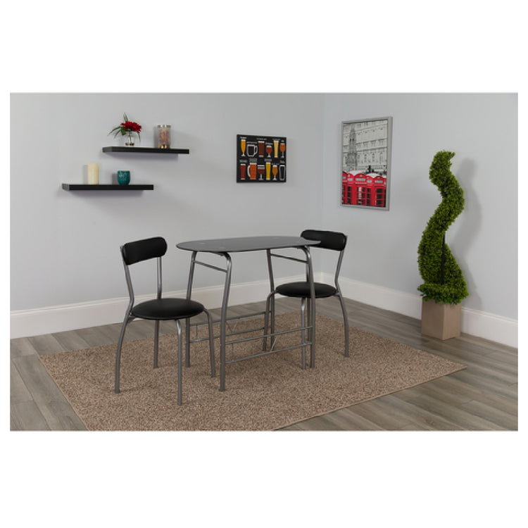 The Flash Furniture XM-JM-A0278-1-2-BK-GG Sutton Bistro Set 3-piece Retro Style is a compact and stylish choice for space-conscious settings, combining elegance with practicality. This set includes a single oval table, measuring 35-1/2"W - 19-3/4"D - 29-1/2"H, featuring a striking 6mm thick black tempered glass top that adds durability and a modern aesthetic. The table is supported by a decorative bottom frame and finished with a silver powder-coated frame, ensuring both stability and a sleek look. Complementing the table are two upholstered open-back design chairs, each with overall dimensions of 16"W - 15-3/4"D - 30-3/4"H. These chairs feature a comfortable upholstered round seat, constructed with CA117 fire retardant foam and covered in black vinyl, providing both safety and style. The chairs also share the same silver powder-coated frame finish, creating a cohesive and sophisticated appearance. Ideal for small dining areas, apartments, or cafes, this bistro set is a versatile and functional addition. Additionally, with its retro styling, it appeals to both residential and commercial markets seeking to incorporate a touch of mid-century charm. This product is designed for those who appreciate both form and function, usually shipping within 24 hours for convenience.
