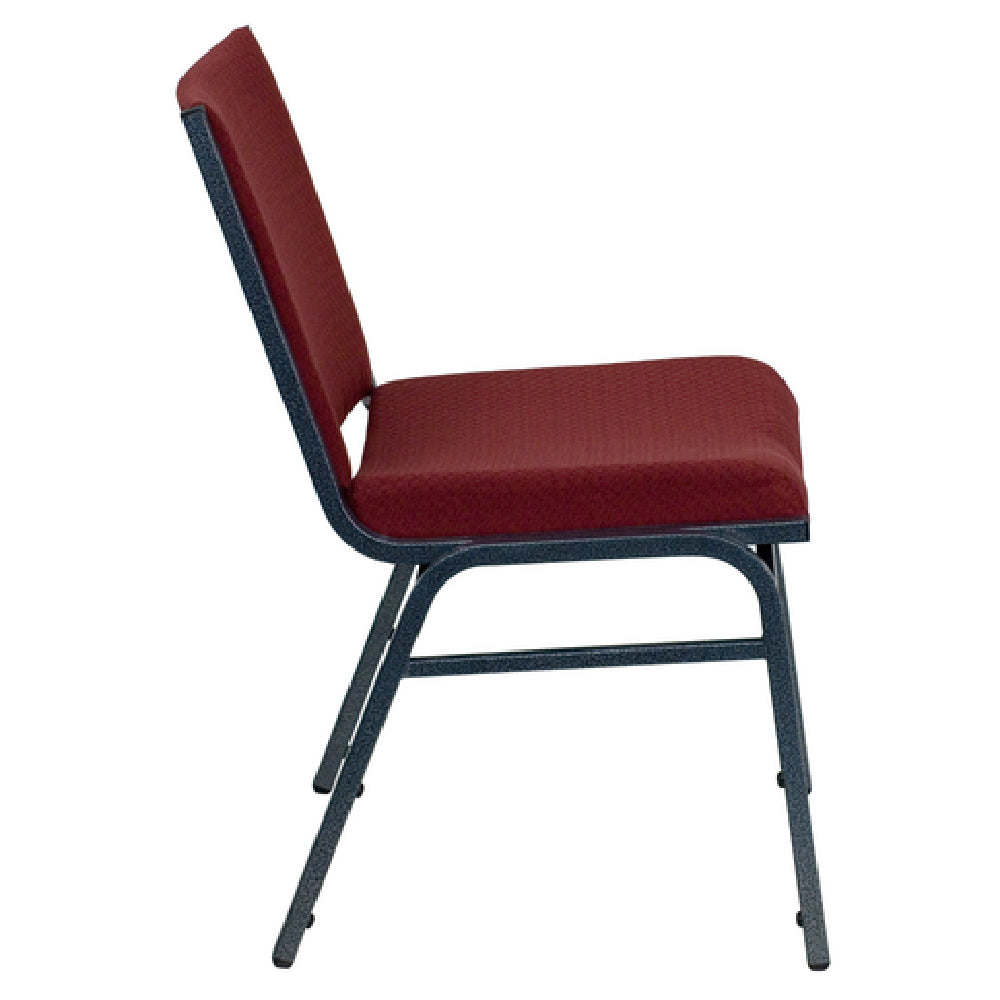 The Flash Furniture XU-60153-BY-GG Hercules Series Heavy Duty Stacking Chair with a 550 lb. weight capacity is engineered for strength and durability, catering to diverse market segments, including venues, offices, and educational institutions. This chair features a patterned polyester upholstery that combines aesthetic appeal with robustness, ensuring long-lasting use. The seat is constructed with a 5/8" thick plywood base, providing a sturdy foundation, and is complemented by contoured cushions filled with 3" thick CA117 fire retardant foam to enhance user comfort and safety. The silver vein powder-coated frame offers a refined finish while the 18 gauge 3/4" square tubular steel frame underpins the chair’s heavy-duty nature. Stretcher bars add extra stability, and a ganging bracket allows for secure alignment when chairs are used in rows. Plastic bumper guards protect the frame during stacking, making it possible to stack up to 12 chairs high efficiently, optimizing space in storage. Additionally, plastic floor glides ensure ease of movement and surface protection. Available in a rich burgundy color, this chair is ideal for high-traffic environments, usually shipping within 24 hours, ensuring prompt availability for immediate needs.