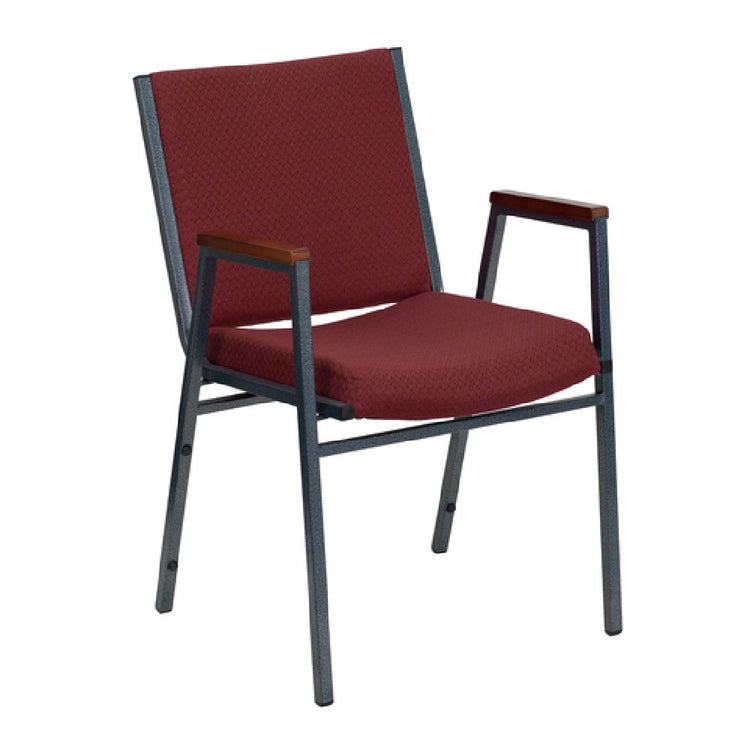 The Flash Furniture XU-60154-BY-GG Hercules Series Heavy Duty Stacking Chair is engineered for durability and versatility, featuring a remarkable weight capacity of 550 lb. This makes it suitable for various settings, from conference rooms to banquet halls, where robust seating solutions are essential. The chair's design includes cherry capped arms and patterned polyester upholstery, ensuring both style and comfort. With a 5/8" thick plywood seat and contoured cushions, it offers ergonomic support, further enhanced by 3" thick CA117 fire retardant foam for safety. The chair's structure is reinforced with stretcher bars and a ganging bracket, providing stability and ease of configuration in multiple chair setups. Its frame is crafted from 18 gauge 3/4" square tubular steel, finished with a silver vein powder coating for added durability and aesthetic appeal. Plastic bumper guards and floor glides protect surfaces and reduce noise, allowing the chair to be stacked up to 12 chairs high for efficient storage. The burgundy finish complements various interior designs, and in-stock items typically ship within 24 hours, making it a reliable choice for both immediate and long-term seating needs.
