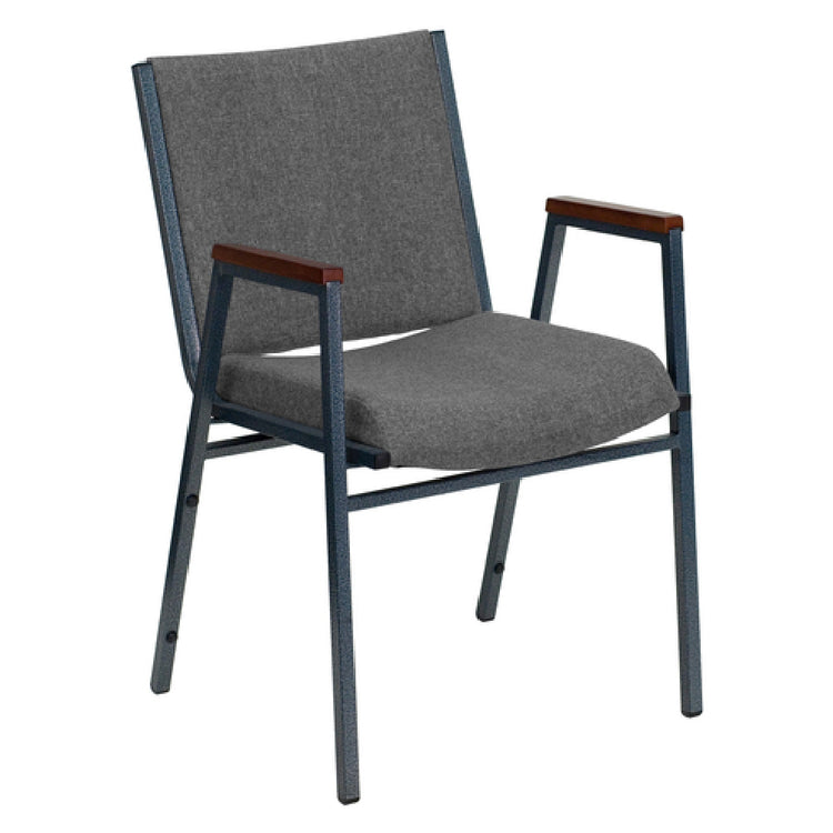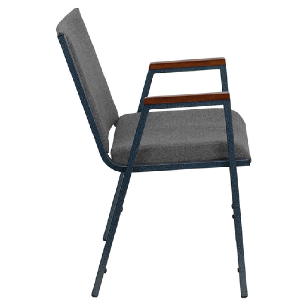 The Flash Furniture XU-60154-GY-GG Hercules Series Heavy Duty Stacking Chair is engineered for exceptional strength and durability, boasting a weight capacity of 550 lb. This chair is ideally suited for various environments, from conference rooms to large event spaces, accommodating diverse seating needs. Constructed with a 5/8" thick plywood seat and covered with polyester upholstery, it features contoured cushions and 3" thick CA117 fire retardant foam for enhanced comfort and safety. The chair's 18 gauge 3/4" square tubular steel frame is finished with a silver vein powder coating, ensuring resistance to wear and tear. Additional functional features include stretcher bars for added stability, a ganging bracket for secure row setup, and plastic bumper guards to prevent damage during stacking. Designed for versatility and efficiency, this model stacks up to 12 chairs high, optimizing storage space. It also includes plastic floor glides to protect flooring surfaces. Available in gray, this chair is typically in stock and ready to ship within 24 hours, making it a reliable choice for businesses or organizations requiring durable and efficient seating solutions.