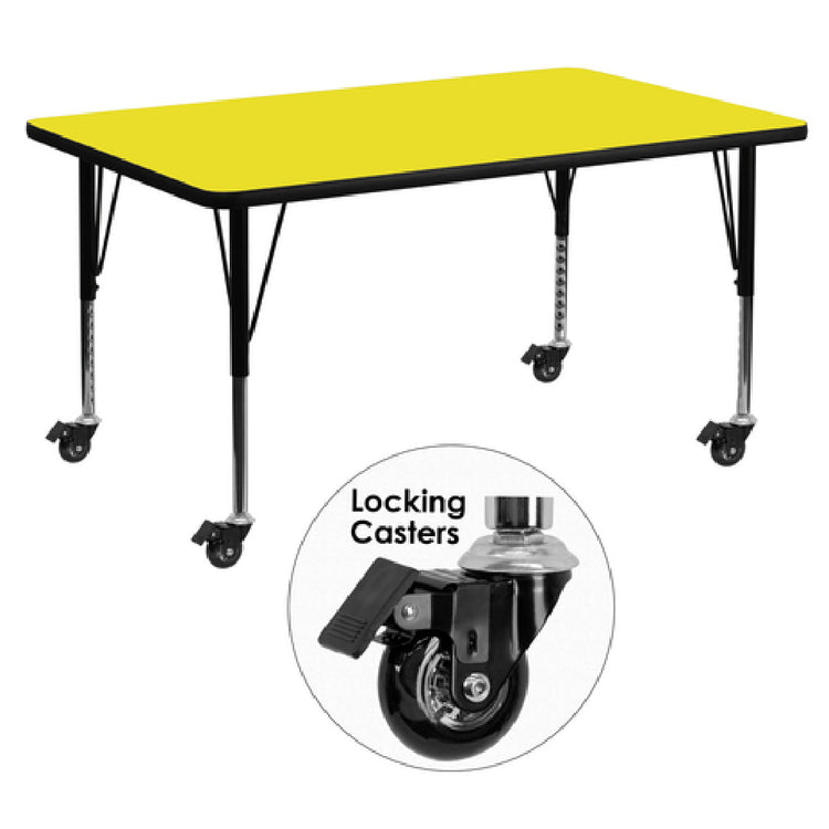 Flash Furniture XU-A2448-REC-YEL-H-P-CAS-GG Activity Table - 48"W x 24"D x 17-1/2" to 25-1/2" Adjustable Height is a versatile piece of furniture, ideal for classrooms, training rooms, and collaborative spaces. This rectangular table boasts a 1-1/4" thick high-pressure yellow laminate top that is both scratch and stain resistant, ensuring durability and longevity in high-use environments. The table's adjustable height feature, ranging from 17-1/2" to 25-1/2", caters to various users and activities, enhancing comfort and ergonomic benefits. Featuring a black edge band for added durability, the table is supported by 16-gauge tubular steel legs, combining robustness with a sleek aesthetic. The black powder-coated upper legs and chrome lower legs offer a stylish contrast while enhancing rust resistance. Equipped with locking casters, this activity table allows for easy mobility and secure placement, making it a flexible solution for dynamic setups. Delivered in two boxes, assembly is required, and in-stock items typically ship within 24 hours, providing a quick and efficient fulfillment solution. This table is not only a functional asset but also a reliable investment for institutions seeking quality and adaptability.