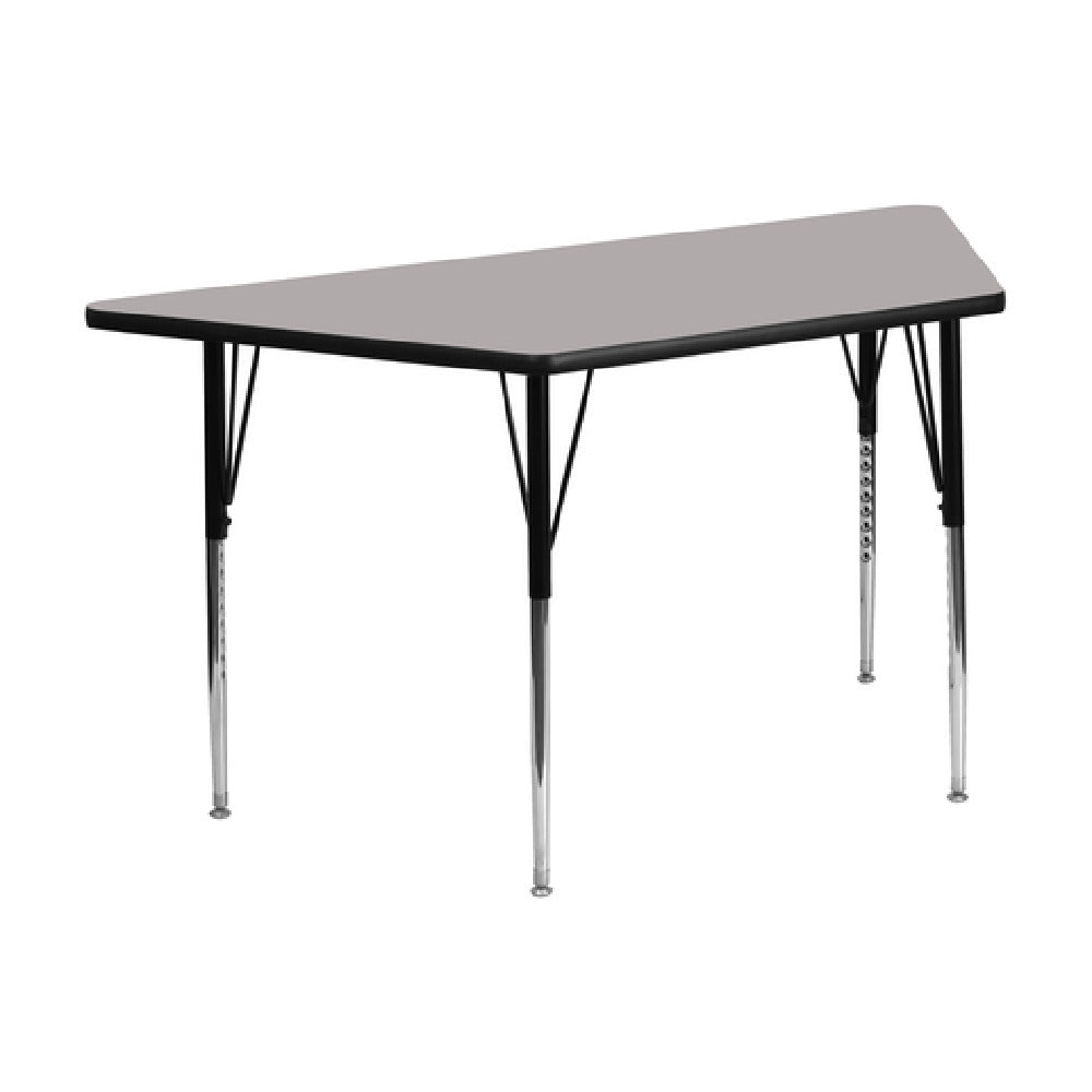 The Flash Furniture XU-A2448-TRAP-GY-H-A-GG Activity Table is a versatile piece, engineered for diverse environments requiring adaptable solutions. Measuring 46-1/4" wide by 25-1/2" deep with an adjustable height ranging from 21-1/4" to 30-1/4", this trapezoid table is designed to cater to multiple seating arrangements and user preferences. The table's 1-1/4" thick high pressure gray laminate top not only provides durability but also boasts a scratch and stain resistant surface, making it ideal for high-traffic areas. The black edge band adds a sleek finish, enhancing its aesthetic appeal. Supported by 16 gauge tubular steel legs, this table combines strength with functionality. The black powder coated upper legs and chrome lower legs offer a modern look while ensuring lasting stability. Self-leveling nylon floor glides are included to maintain balance on uneven surfaces, making this table a reliable choice in both educational and professional settings. Shipped in two boxes, this product usually dispatches within 24 hours for in-stock items, ensuring prompt delivery. The Flash Furniture XU-A2448-TRAP-GY-H-A-GG Activity Table is an exceptional choice for those seeking flexibility, durability, and style in their furnishings.
